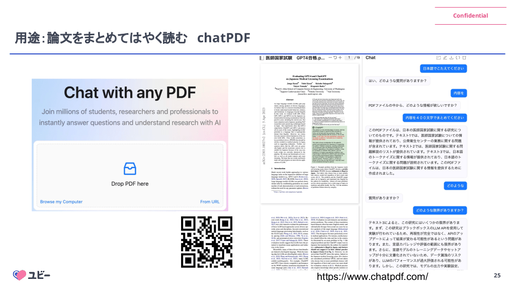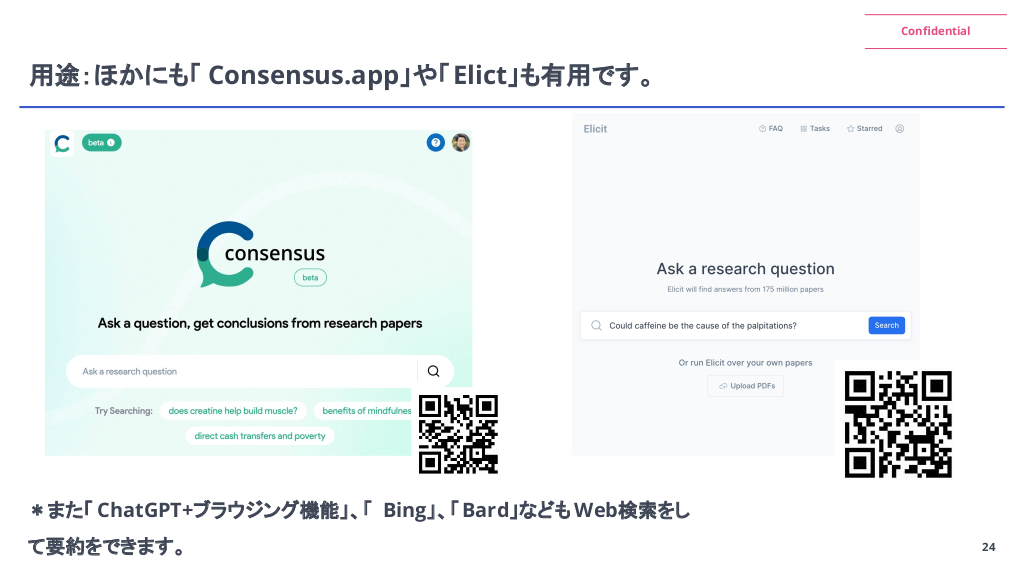 Confidential 用途:ほかにも「 Consensus.app」や「Elict」も有用です。 *また「 ChatGPT+ブラウジング機能」、「 Bing」、「 Bard」なども Web検索をし て要約をできます。 24 AIと医療の未来に向けた考察 #26.