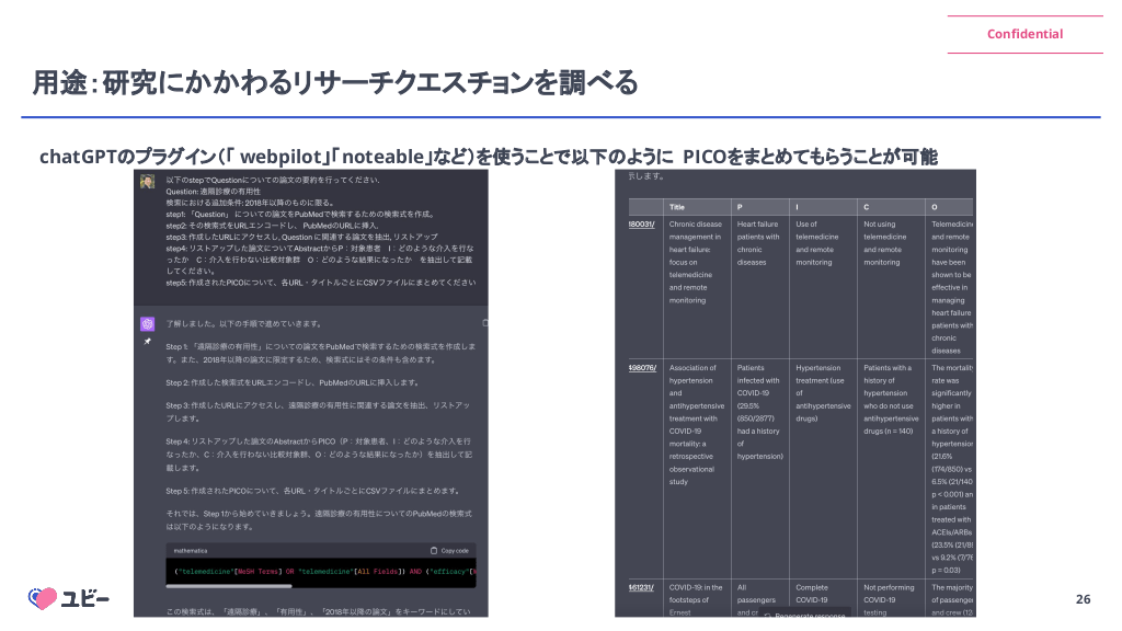 Confidential 用途:研究にかかわるリサーチクエスチョンを調べる chatGPTのプラグイン(「 webpilot」「noteable」など)を使うことで以下のように PICOをまとめてもらうことが可能 26 #27.