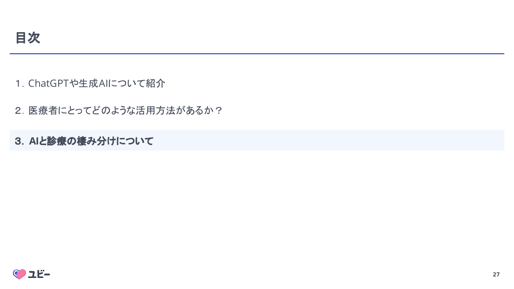 目次 1.ChatGPTや生成AIについて紹介 2.医療者にとってどのような活用方法があるか? 3.AIと診療の棲み分けについて 27 #28.