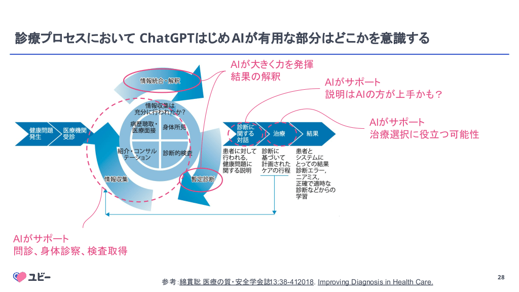 診療プロセスにおいて ChatGPTはじめAIが有用な部分はどこかを意識する AIが大きく力を発揮 結果の解釈 AIがサポート 説明はAIの方が上手かも? AIがサポート 治療選択に役立つ可能性 AIがサポート 問診、身体診察、検査取得 参考:綿貫聡 医療の質・安全学会誌13:38-412018. Improving Diagnosis in Health Care. 28 #29.