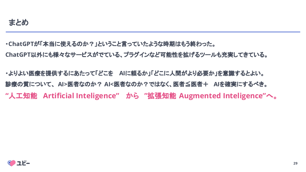 まとめ ・ChatGPTが「本当に使えるのか?」ということ言っていたような時期はもう終わった。 ChatGPT以外にも様々なサービスがでている、プラグインなど可能性を拡げるツールも充実してきている。 ・よりよい医療を提供するにあたって「どこを AIに頼るか」「どこに人間がより必要か」を意識するとよい。 診療の質について、 AI>医者なのか? AI<医者なのか?ではなく、医者≦医者+ AIを確実にするべき。 “人工知能 Artificial Inteligence” から ”拡張知能 Augmented Inteligence”へ。 29