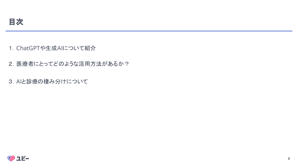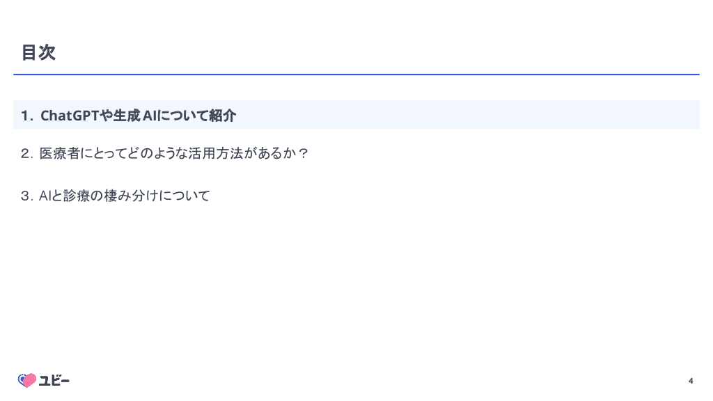 目次 1.ChatGPTや生成AIについて紹介 2.医療者にとってどのような活用方法があるか? 3.AIと診療の棲み分けについて 3 #4.