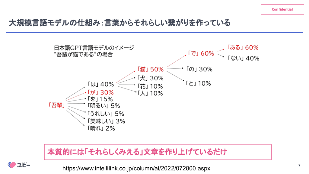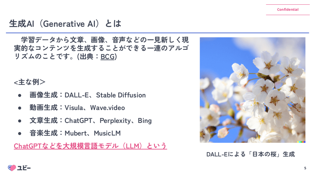 Confidential 生成AI(Generative AI)とは 学習データから文章、画像、音声などの一見新しく現 実的なコンテンツを生成することができる一連のアルゴ リズムのことです。(出典:BCG) <主な例> ● 画像生成:DALL-E、Stable Diffusion ● 動画生成:Visula、Wave.video ● 文章生成:ChatGPT、Perplexity、Bing ● 音楽生成:Mubert、MusicLM ChatGPTなどを大規模言語モデル(LLM)という DALL-Eによる「日本の桜」生成 5 #6.