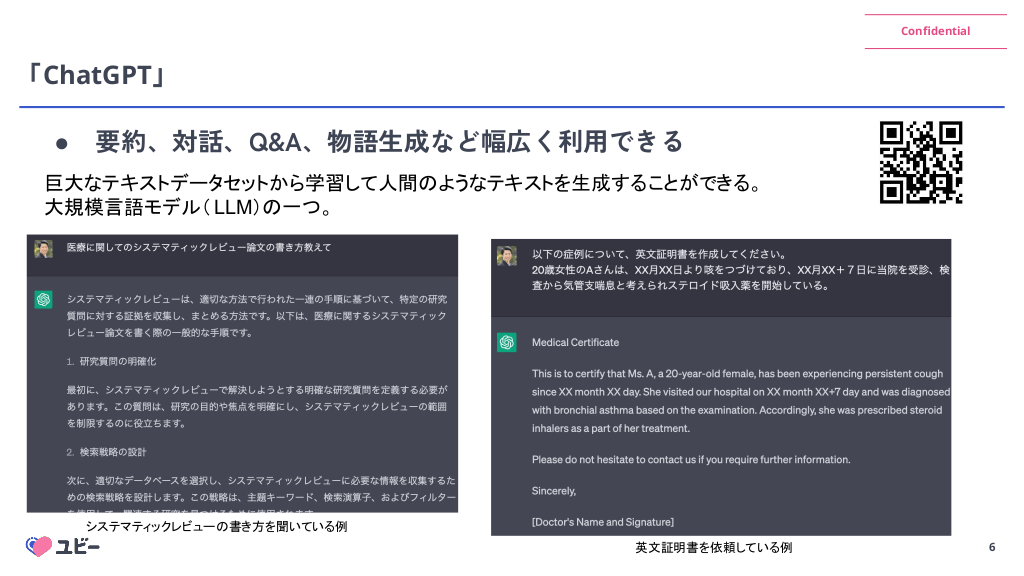 Confidential 「ChatGPT」 ● 要約、対話、Q&A、物語生成など幅広く利用できる 巨大なテキストデータセットから学習して人間のようなテキストを生成することができる。 大規模言語モデル( LLM)の一つ。 システマティックレビューの書き方を聞いている例 英文証明書を依頼している例 6 #8.