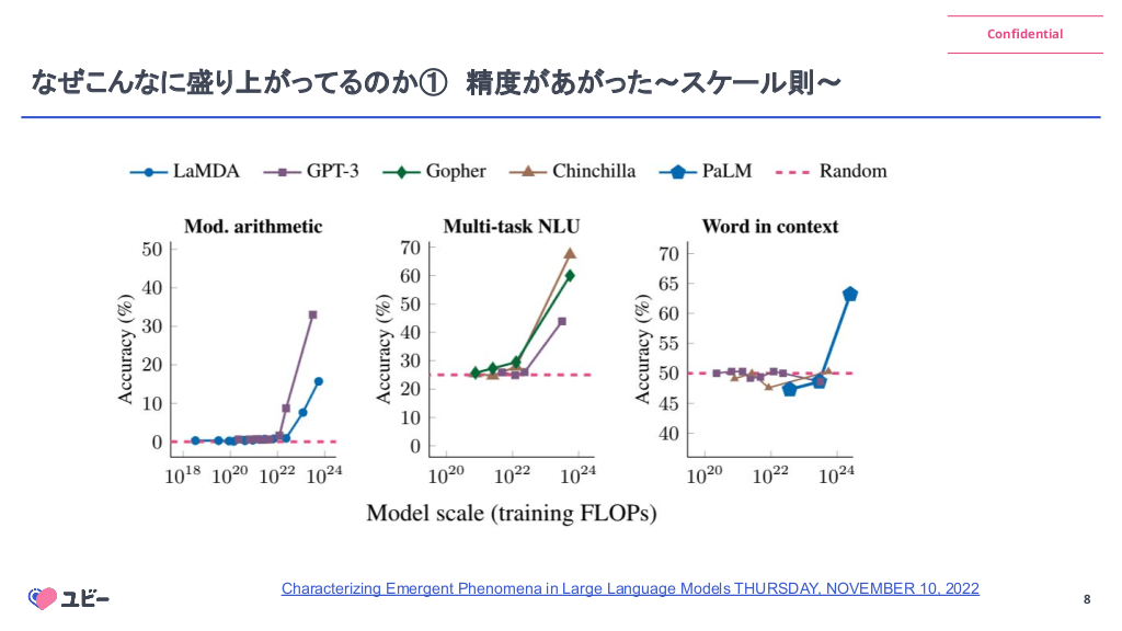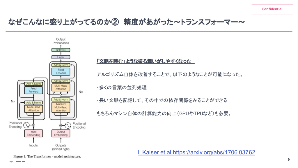 Confidential なぜこんなに盛り上がってるのか① 精度があがった〜スケール則〜 Characterizing Emergent Phenomena in Large Language Models THURSDAY, NOVEMBER 10, 2022 8 #9. Confidential なぜこんなに盛り上がってるのか② 精度があがった〜トランスフォーマー〜 「文脈を読む」ような振る舞いがしやすくなった アルゴリズム自体を改善することで、以下のようなことが可能になった。 ・多くの言葉の並列処理 ・長い文脈を記憶して、その中での依存関係をみることができる もちろんマシン自体の計算能力の向上(GPUやTPUなど)も必要。 L Kaiser et al.https://arxiv.org/abs/1706.03762 9 #10.