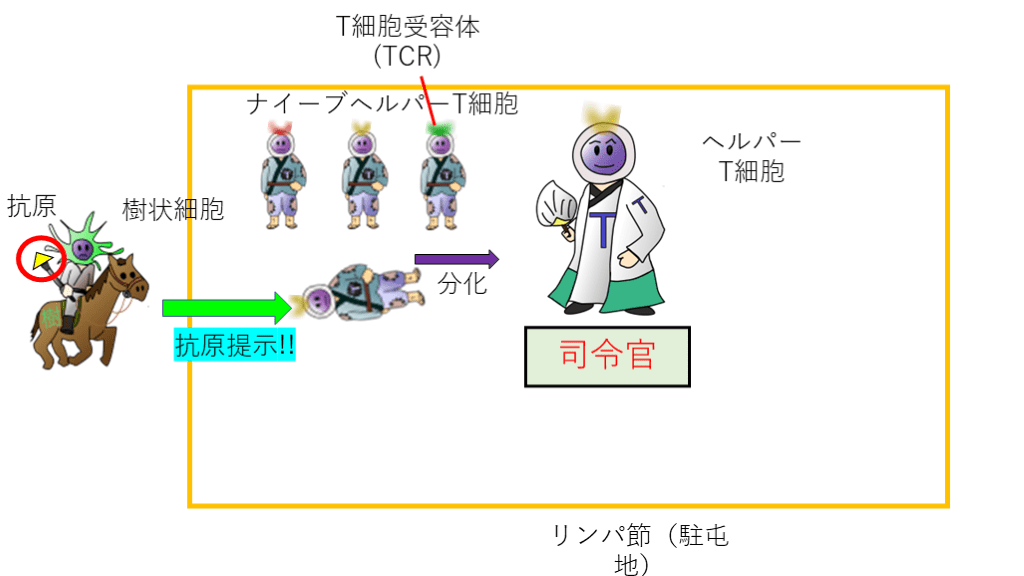 このナイーブヘルパーT細胞は【ナイーブ:幼稚、ガキンちょ】という意味の通り、この時点では特に何もできないただのガキンちょヘルパーT細胞なのですが、抗原提示がなされると、分化・成熟してヘルパーT細胞という名の立派な司令官に成長します。