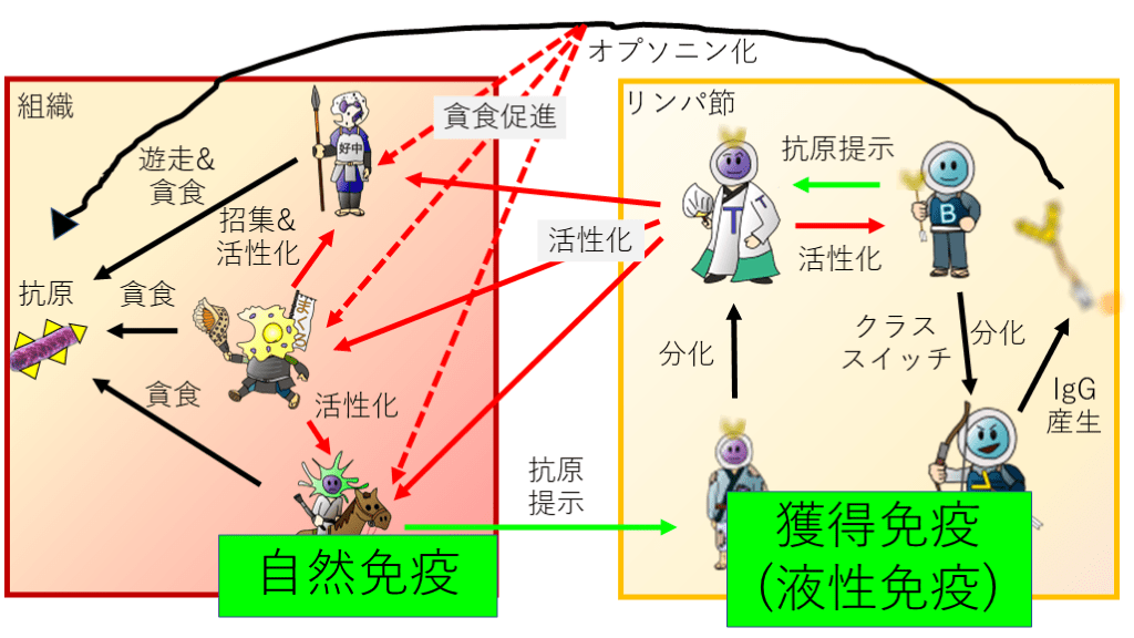 ①最前線で戦っているマクロファージ、好中球をサイトカインで応援して活性化