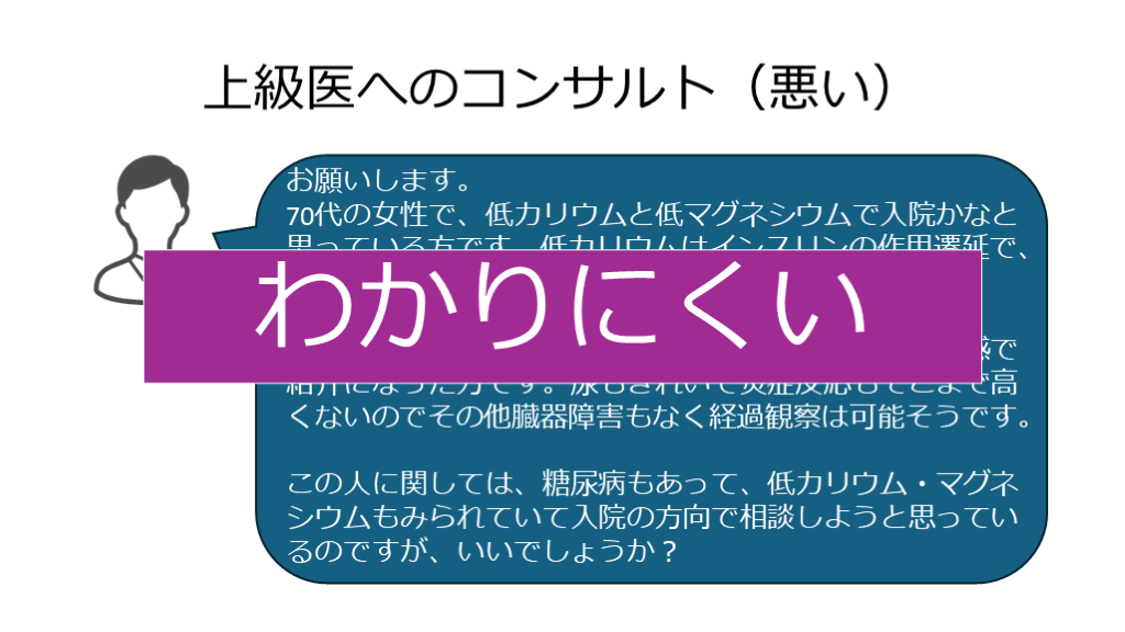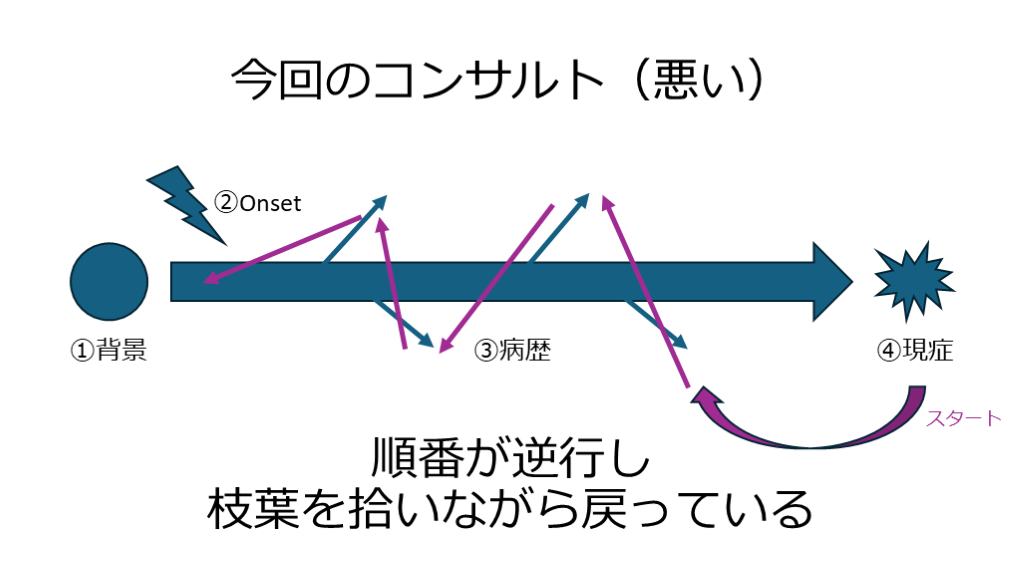 #10. 今回のコンサルト(悪い) ①背景 ②Onset ③病歴 ④現症 順番が逆行し