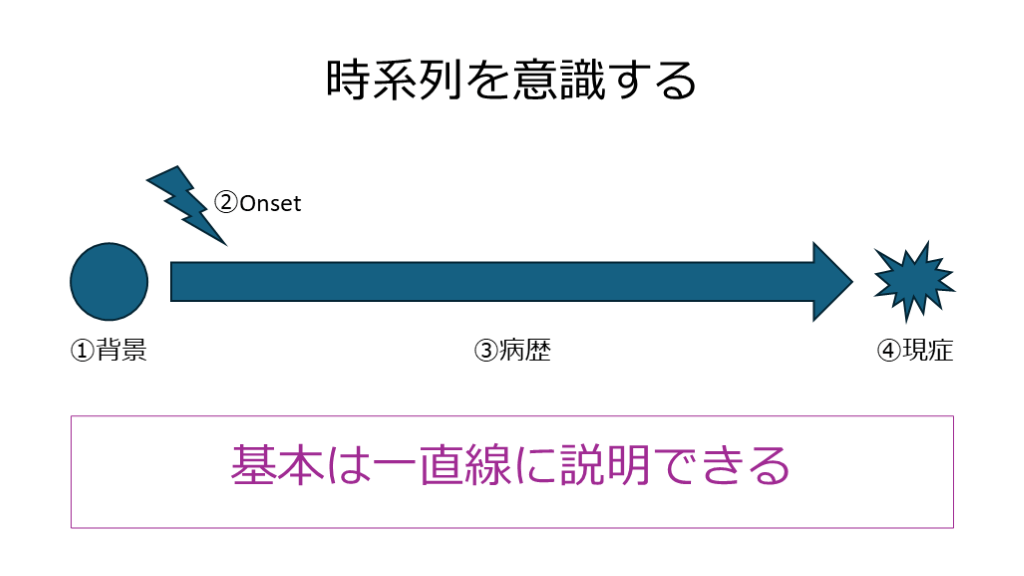 #7. 時系列を意識する ①背景 ②Onset ③病歴 ④現症 基本は一直線に説明できる