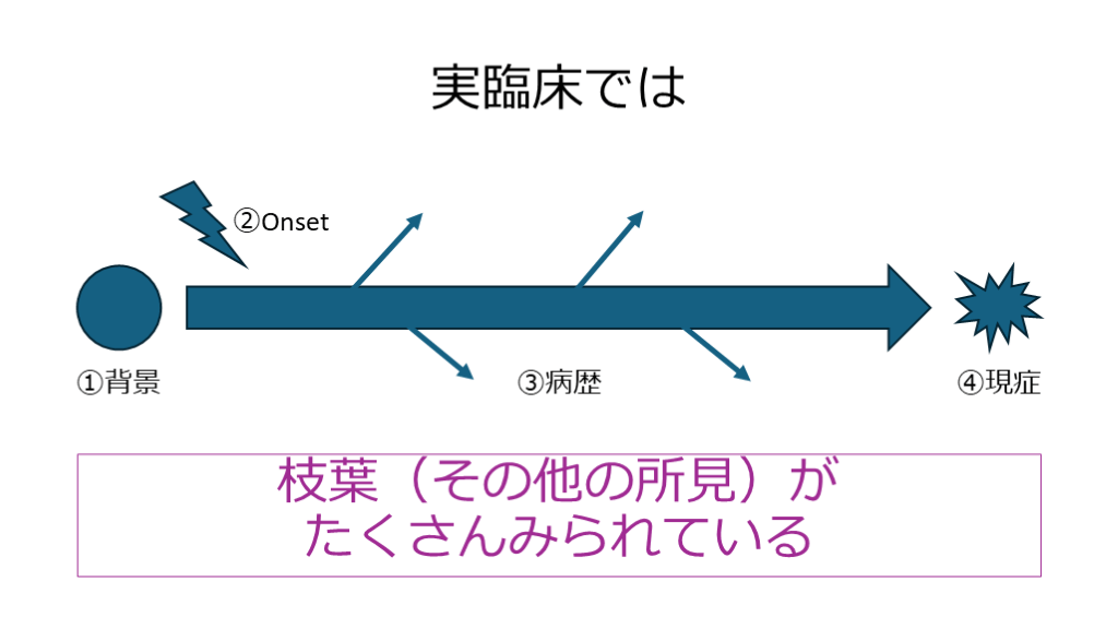 #8. 実臨床では ①背景 ②Onset ③病歴 ④現症 枝葉(その他の所見)が