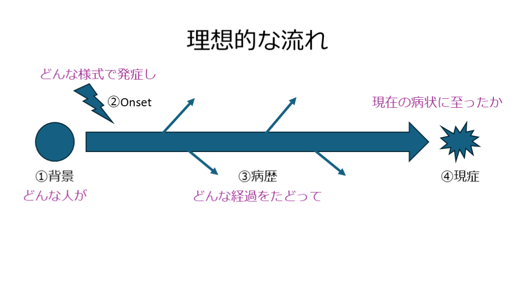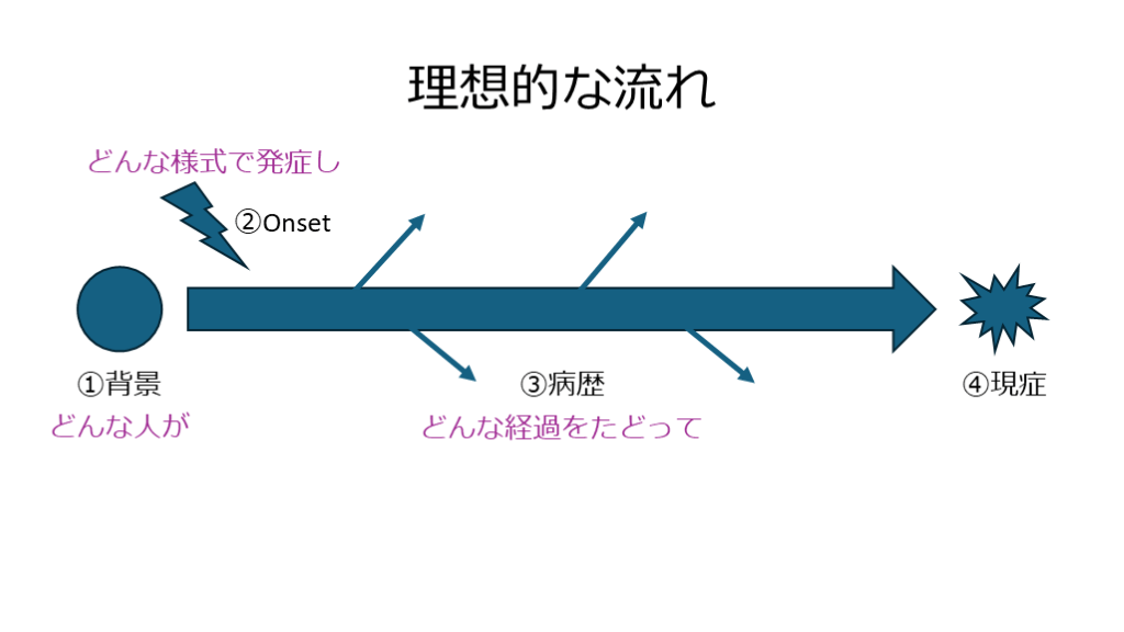 #13. 理想的な流れ ①背景 ②Onset ③病歴 ④現症 どんな人が どんな様式で発症し