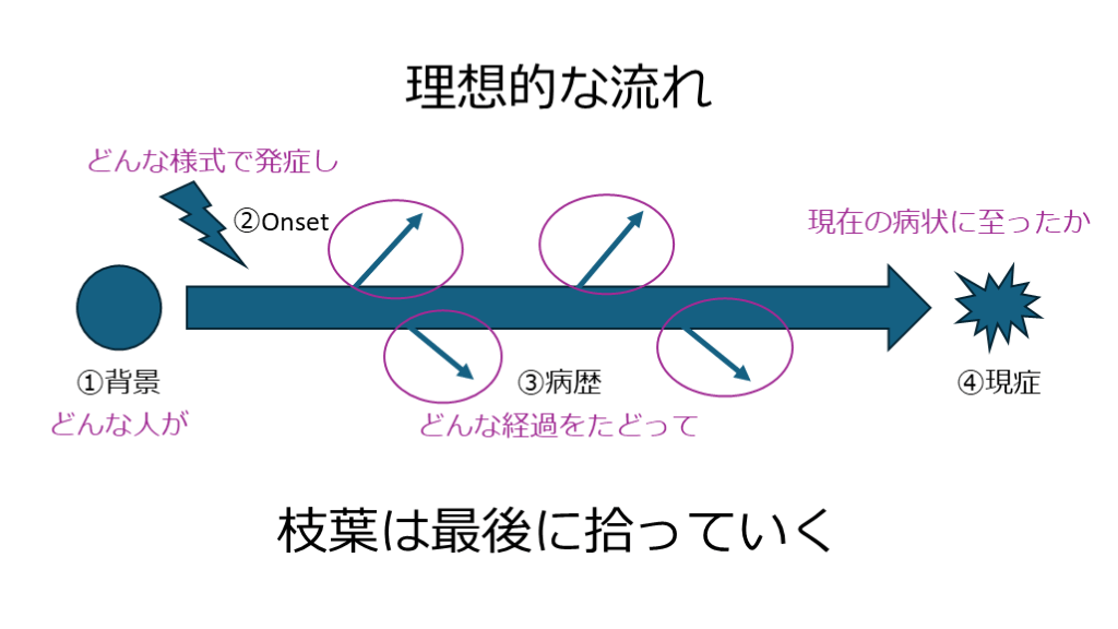#16. 理想的な流れ ①背景 ②Onset ③病歴 ④現症 どんな人が どんな様式で発症し どんな経過をたどって 現在の病状に至ったか 枝葉は最後に拾っていく