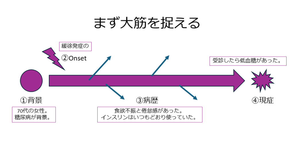 #18. まず大筋を捉える ①背景 ②Onset ③病歴 ④現症 70代の女性。