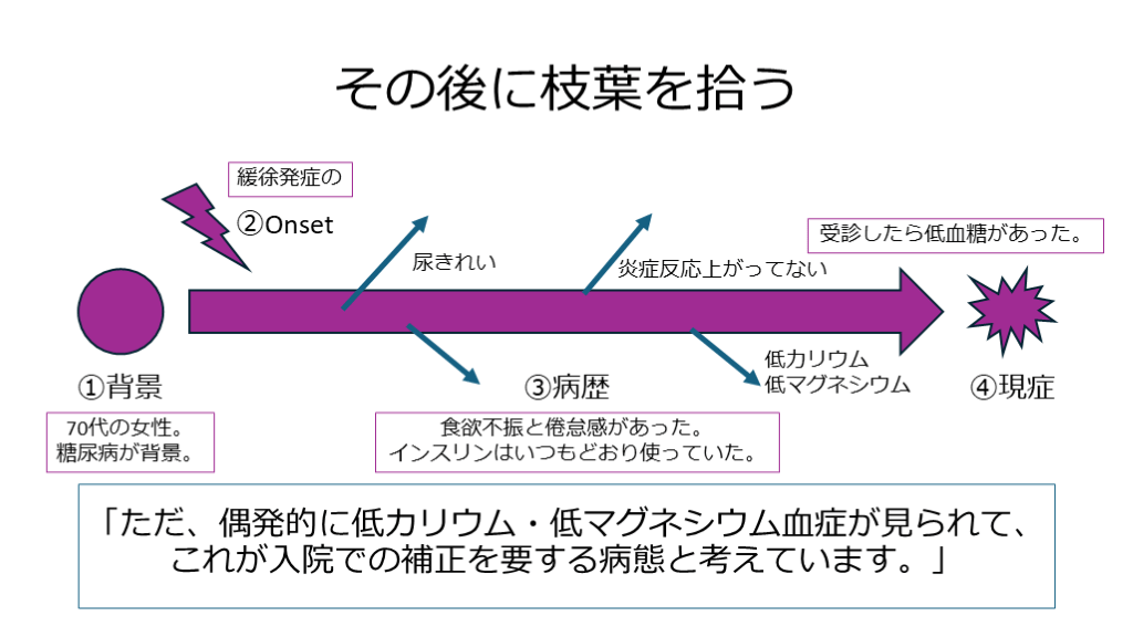 #19. その後に枝葉を拾う ①背景 ②Onset ③病歴 ④現症 70代の女性。