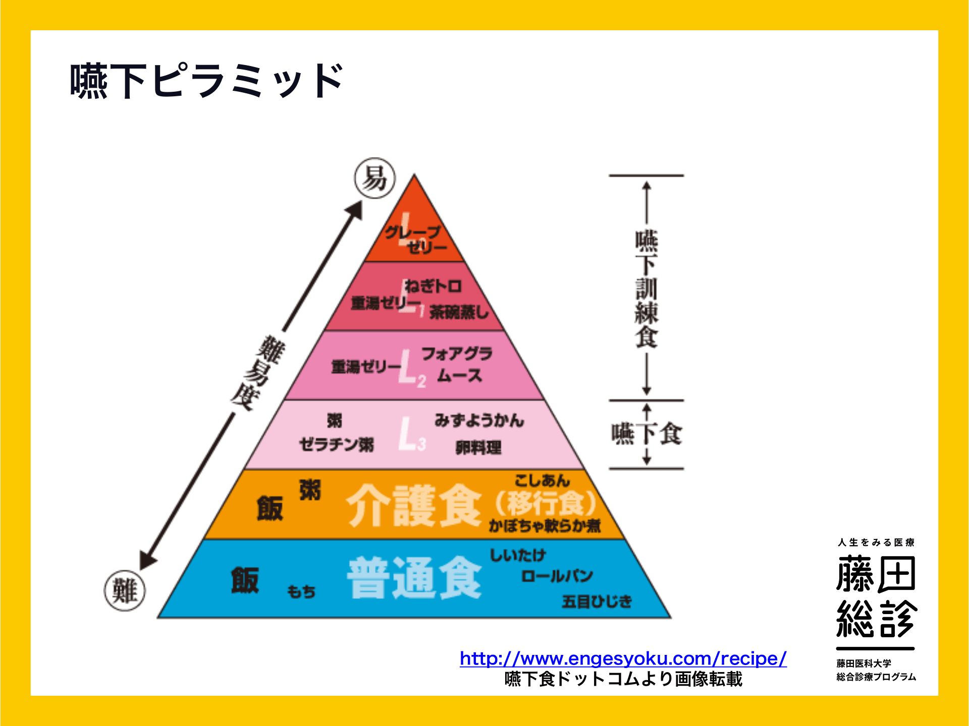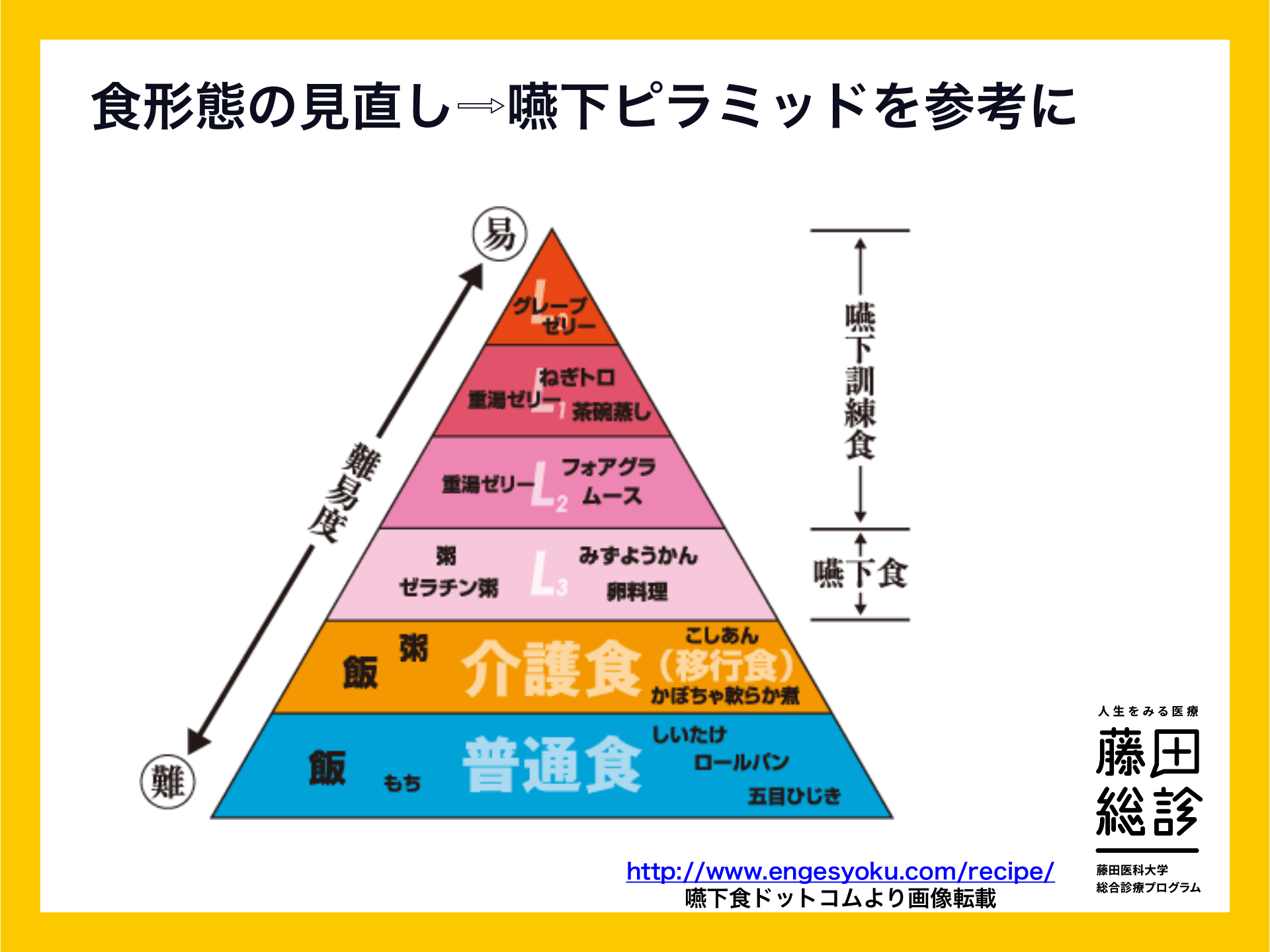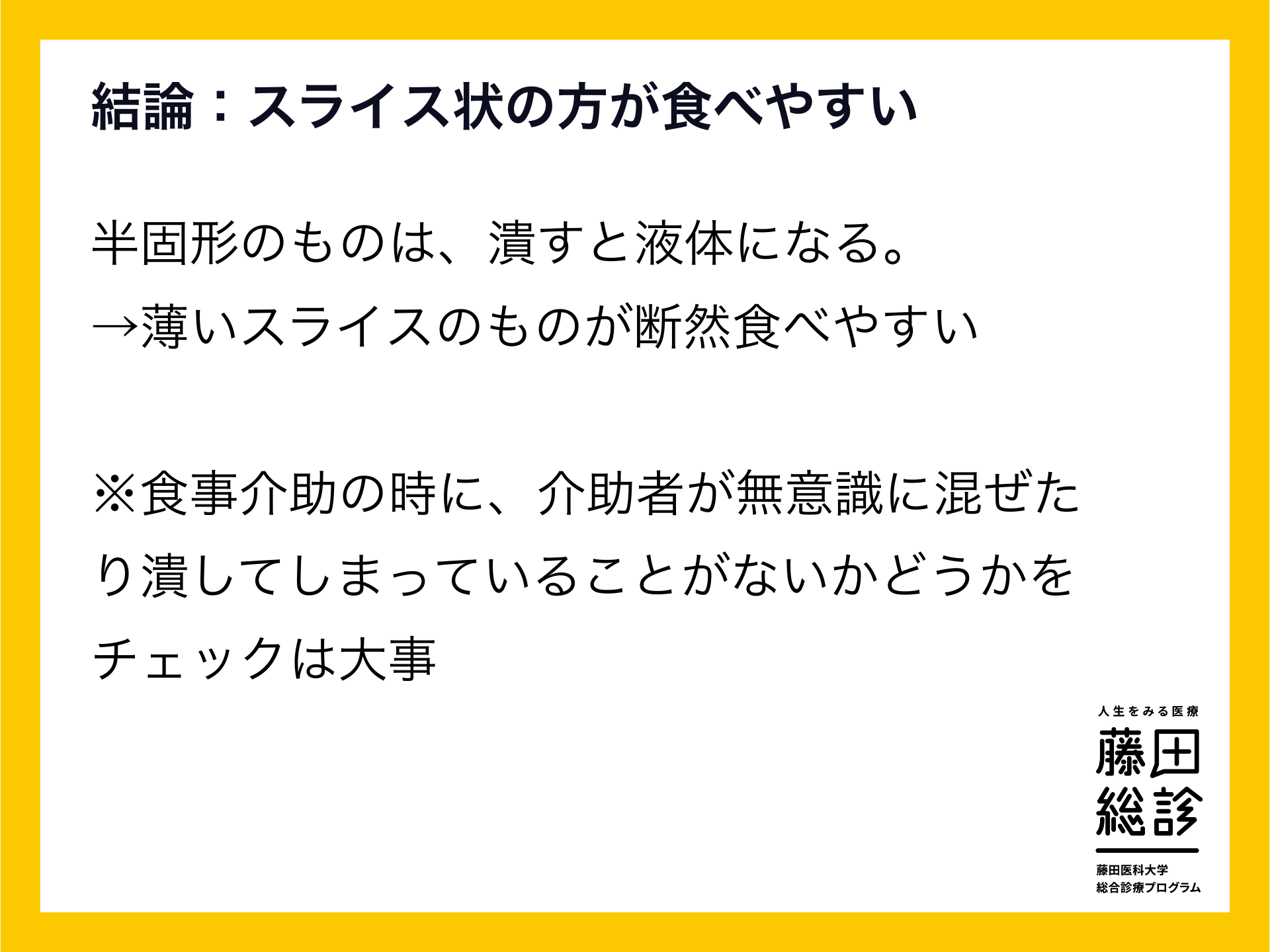 #42. 結論:スライス状の方が食べやすい 半固形のものは、潰すと液体になる。 →薄いスライスのものが断然食べやすい ※食事介助の時に、介助者が無意識に混ぜた り潰してしまっていることがないかどうかを チェックは大事 Copyright FUJITA SOUSHIN PROGAM All Right Reserved.