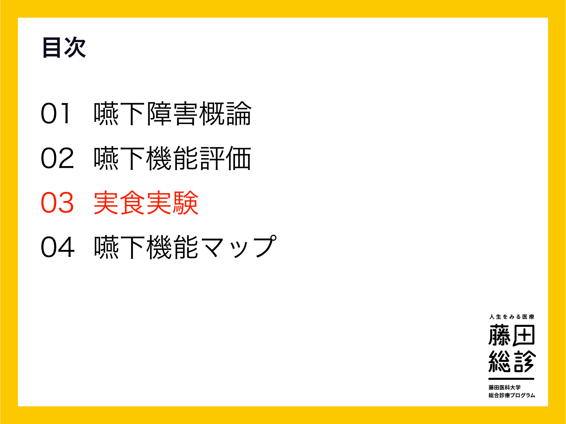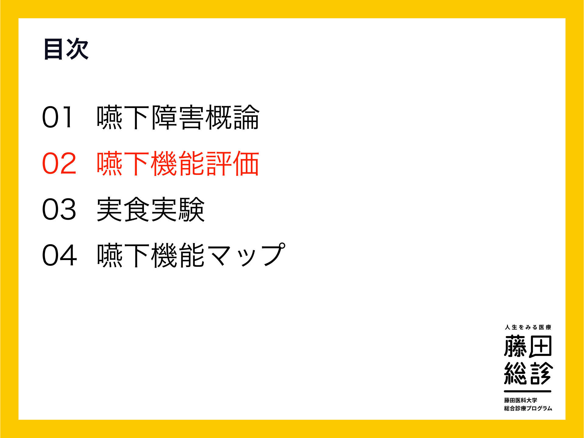 #2. 目次 01 嚥下障害概論 02 嚥下機能評価 03 実食実験 04 嚥下医療資源マップ Copyright FUJITA SOUSHIN PROGAM All Right Reserved.
