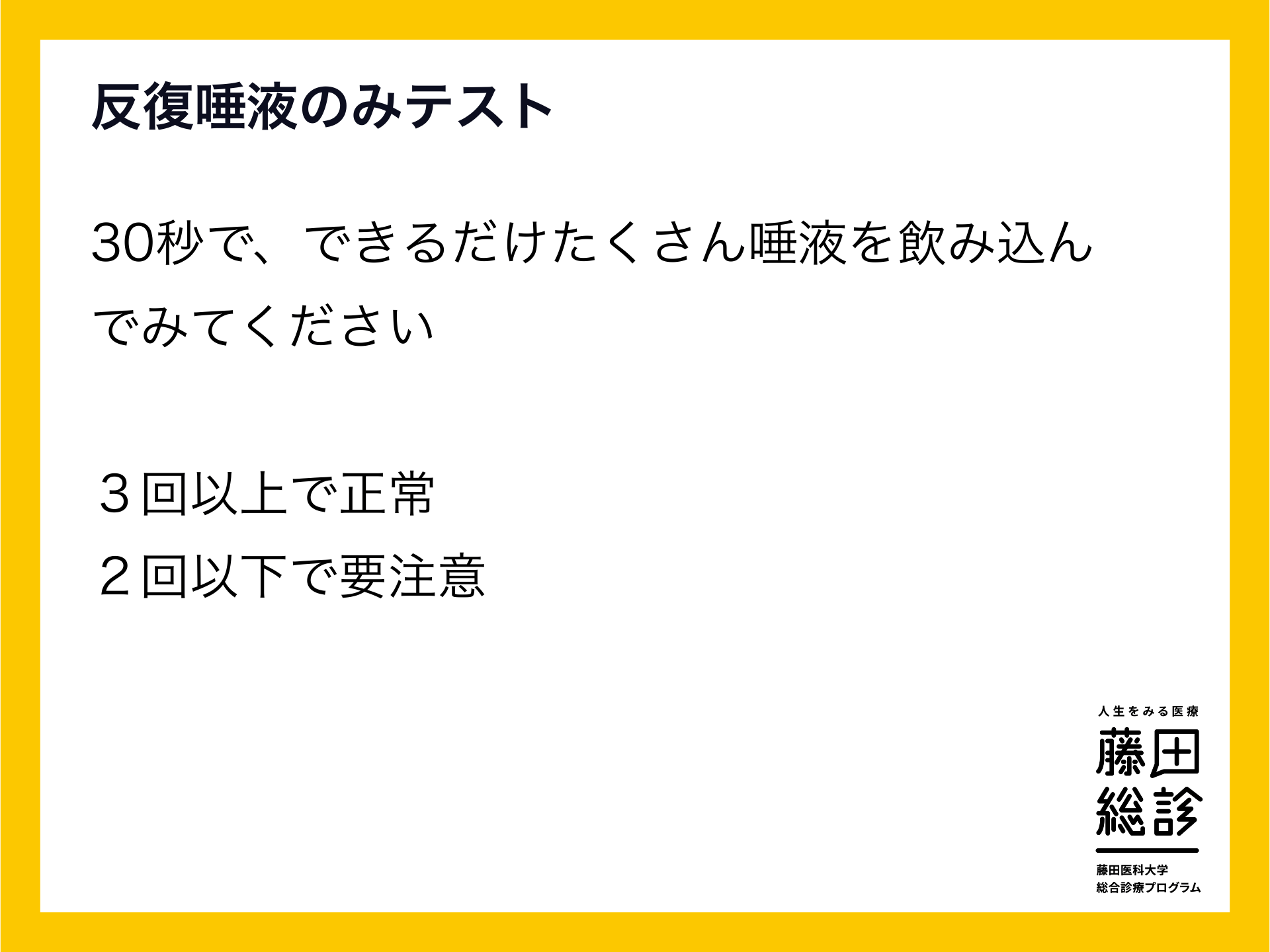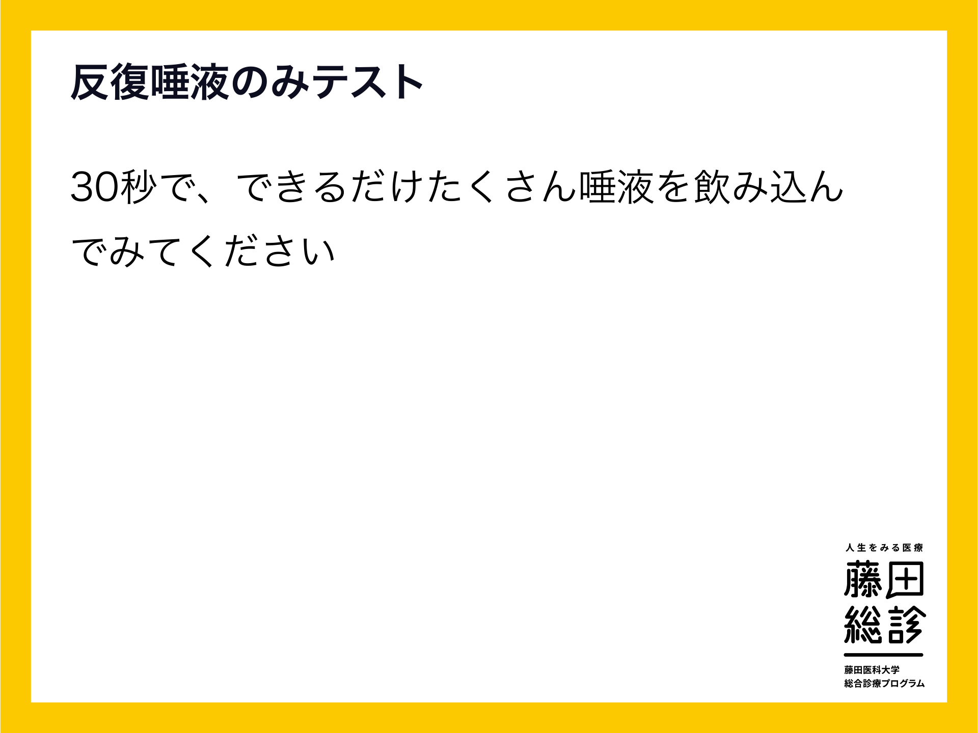 #19. 反復唾液のみテスト 30秒で、できるだけたくさん唾液を飲み込ん でみてください 3回以上で正常 2回以下で要注意 Copyright FUJITA SOUSHIN PROGAM All Right Reserved.