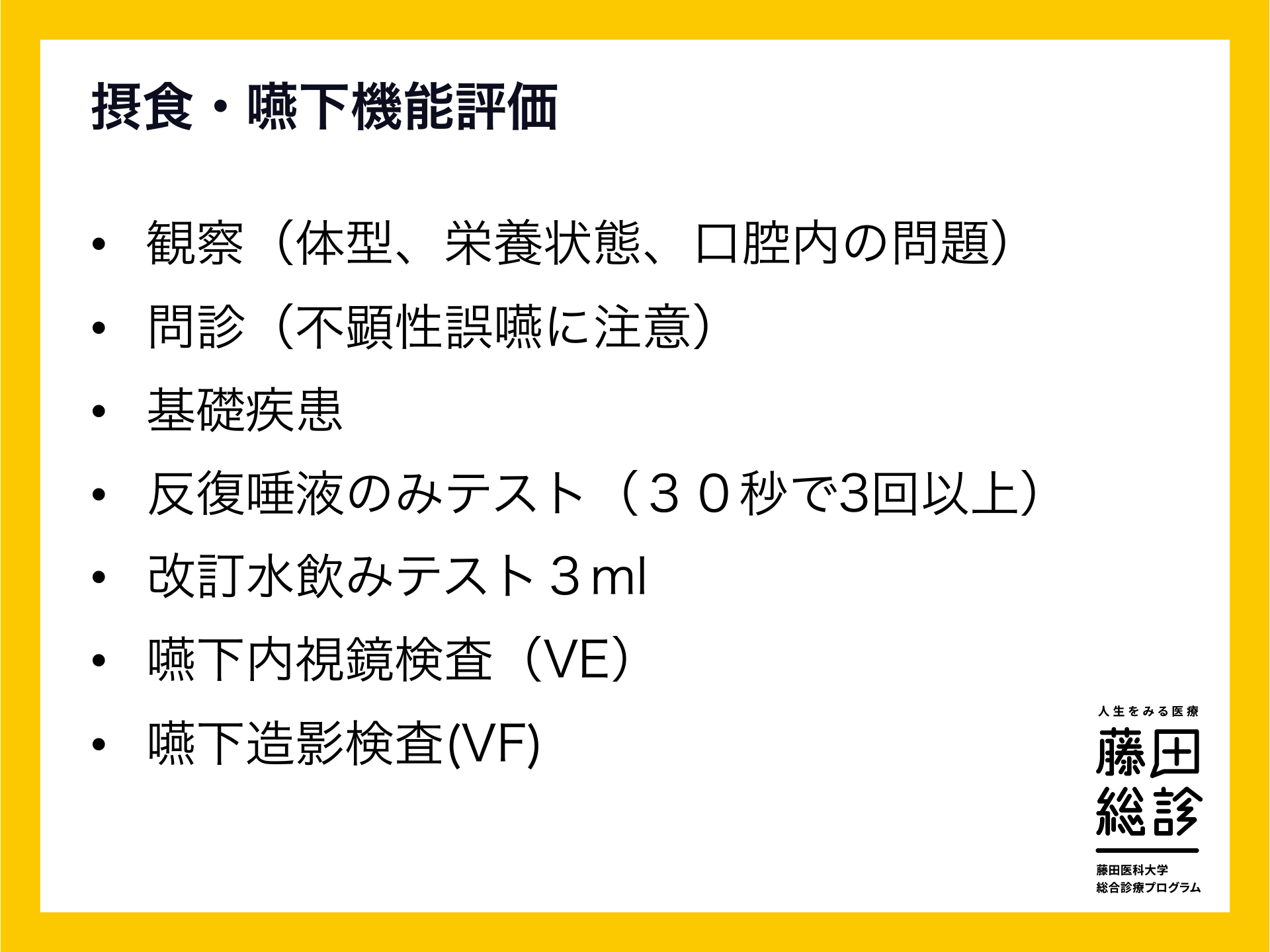 #20. 摂食・嚥下機能評価 • 観察(体型、栄養状態、口腔内の問題) • 問診(不顕性誤嚥に注意) • 基礎疾患 • 反復唾液のみテスト(30秒で3回以上) • 改訂水飲みテスト3ml • 嚥下内視鏡検査(VE) • 嚥下造影検査(VF) Copyright FUJITA SOUSHIN PROGAM All Right Reserved.
