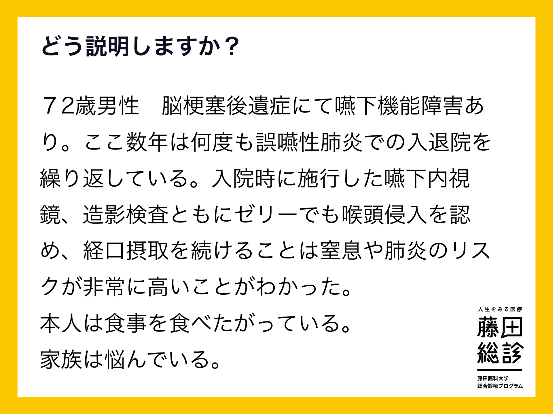 #24. どう説明しますか? 72歳男性 脳 塞後遺症にて嚥下機能障害あ り。ここ数年は何度も誤嚥性肺炎での入退院を 繰り返している。入院時に施行した嚥下内視 鏡、造影検査ともにゼリーでも喉頭侵入を認 め、経口摂取を続けることは窒息や肺炎のリス クが非常に高いことがわかった。 本人は食事を食べたがっている。 家族は悩んでいる。 Copyright FUJITA SOUSHIN PROGAM All Right Reserved.