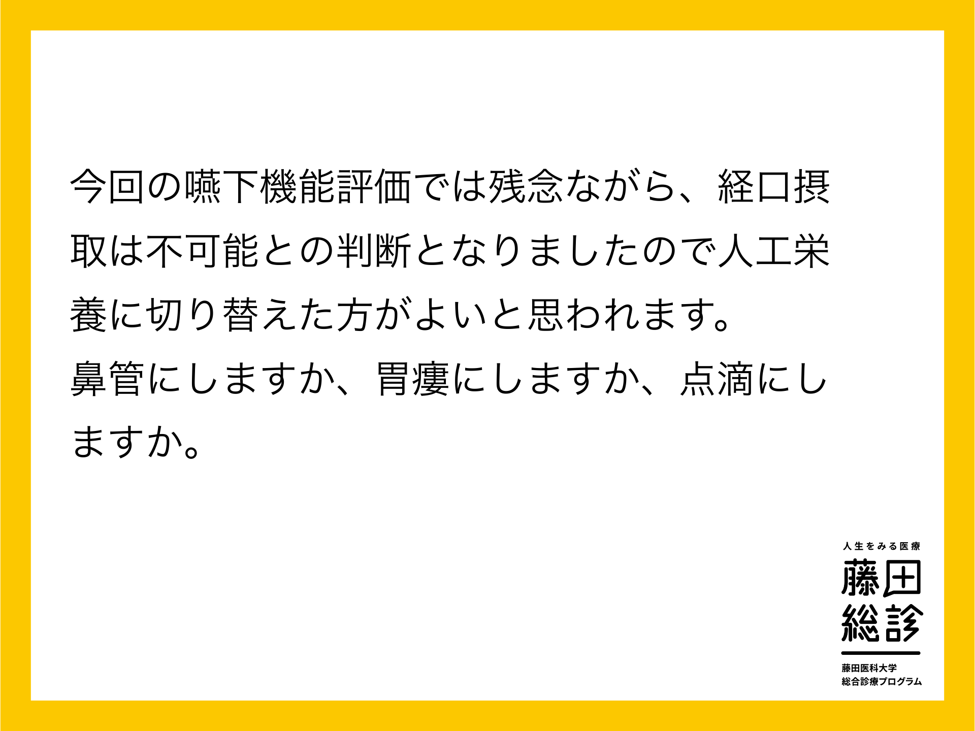 #25. 今回の嚥下機能評価では残念ながら、経口摂 取は不可能との判断となりましたので人工栄 養に切り替えた方がよいと思われます。 鼻管にしますか、胃瘻にしますか、点滴にし ますか。 Copyright FUJITA SOUSHIN PROGAM All Right Reserved.