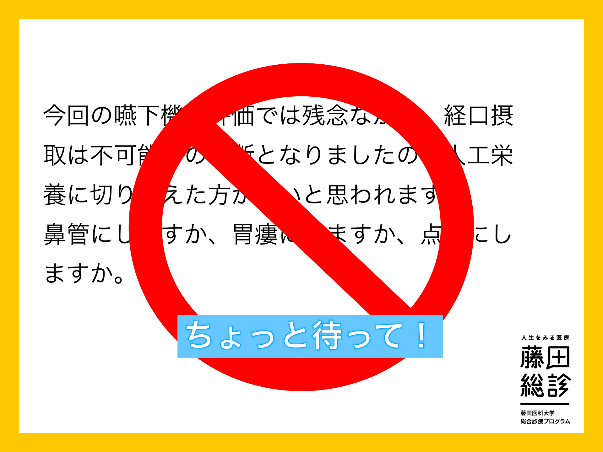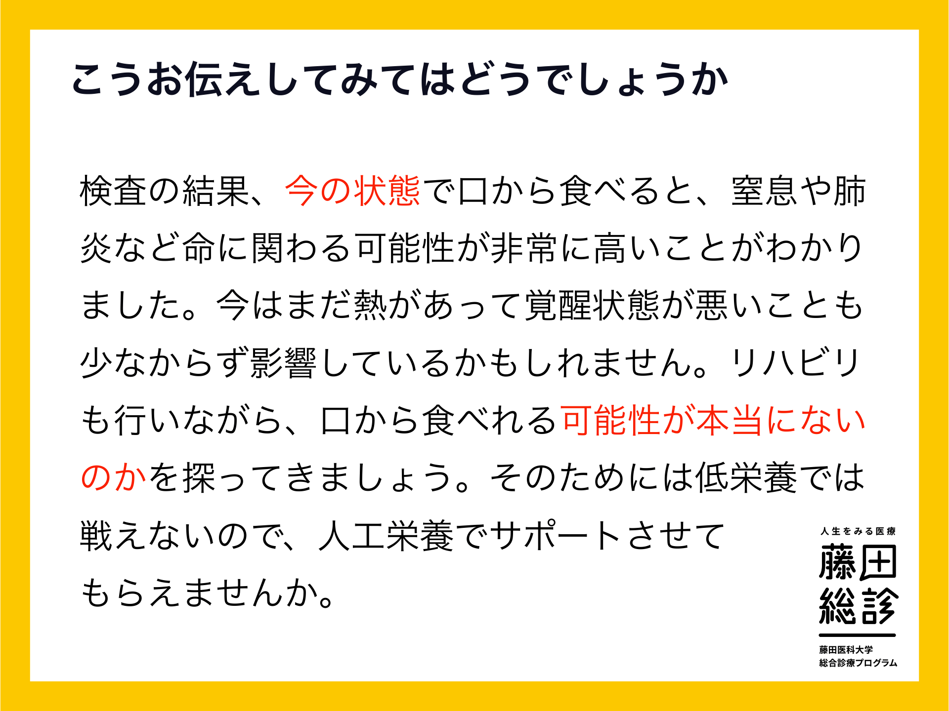 #28. こうお伝えしてみてはどうでしょうか 検査の結果、今の状態で口から食べると、窒息や肺 炎など命に関わる可能性が非常に高いことがわかり ました。今はまだ熱があって覚醒状態が悪いことも 少なからず影響しているかもしれません。リハビリ も行いながら、口から食べれる可能性が本当にない のかを探ってきましょう。そのためには低栄養では 戦えないので、人工栄養でサポートさせて もらえませんか。 Copyright FUJITA SOUSHIN PROGAM All Right Reserved.