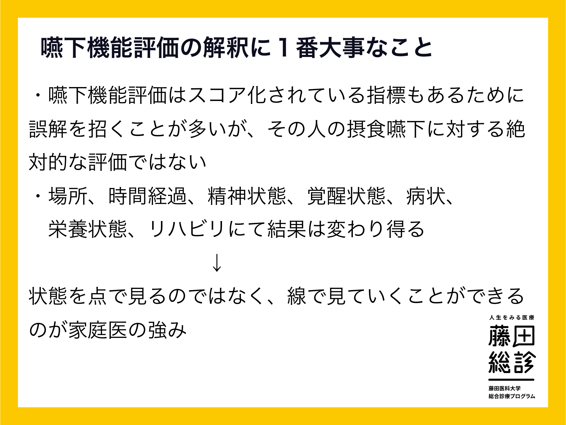 #27. 嚥下機能評価の解釈に1番大事なこと ・嚥下機能評価はスコア化されている指標もあるために 誤解を招くことが多いが、その人の摂食嚥下に対する絶 対的な評価ではない ・場所、時間経過、精神状態、覚醒状態、病状、 栄養状態、リハビリにて結果は変わり得る ↓ 状態を点で見るのではなく、線で見ていくことができる のが家庭医の強み Copyright FUJITA SOUSHIN PROGAM All Right Reserved.
