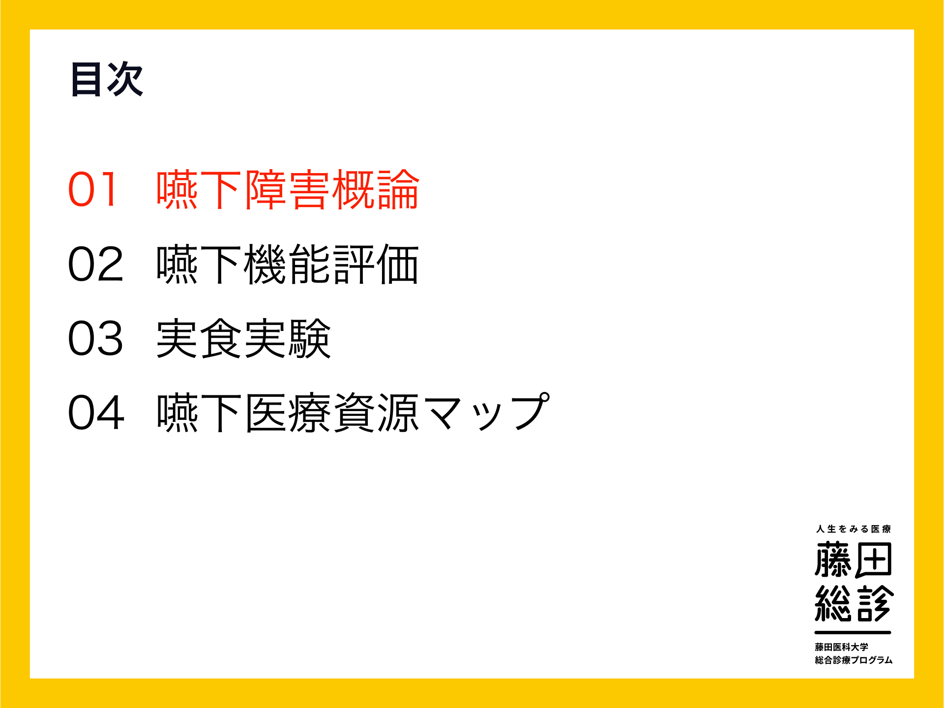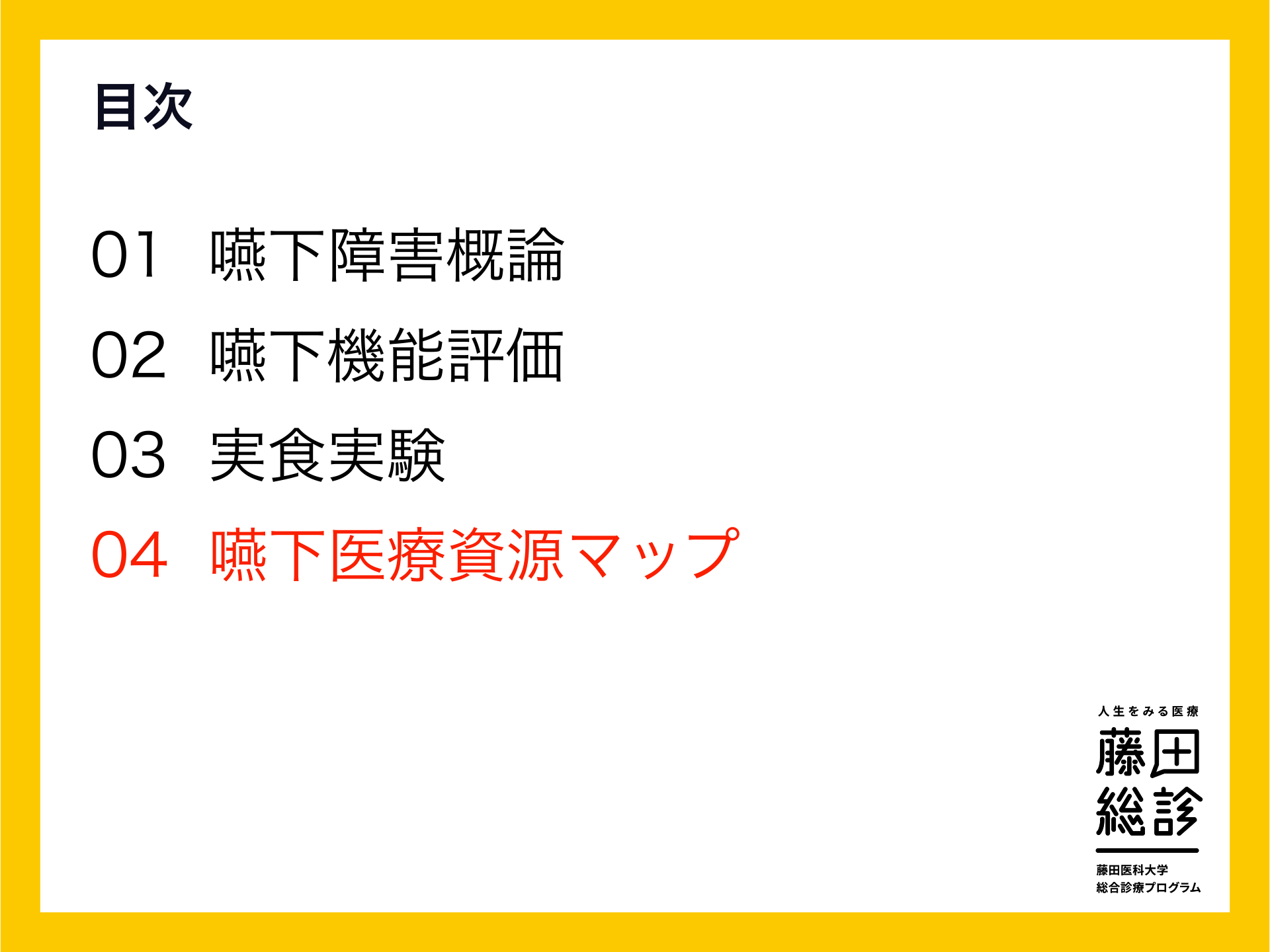 #46. 目次 01 嚥下障害概論 02 嚥下機能評価 03 実食実験 04 嚥下医療資源マップ Copyright FUJITA SOUSHIN PROGAM All Right Reserved.