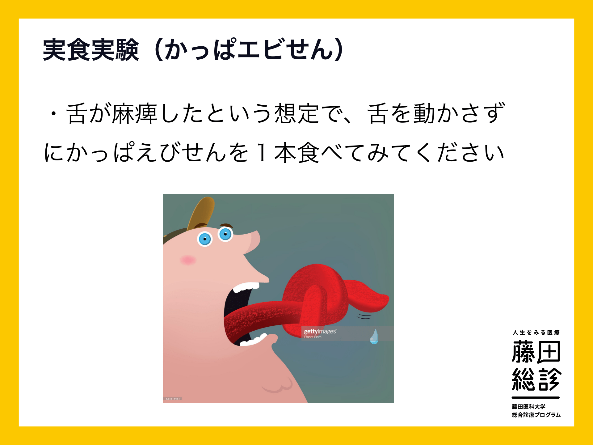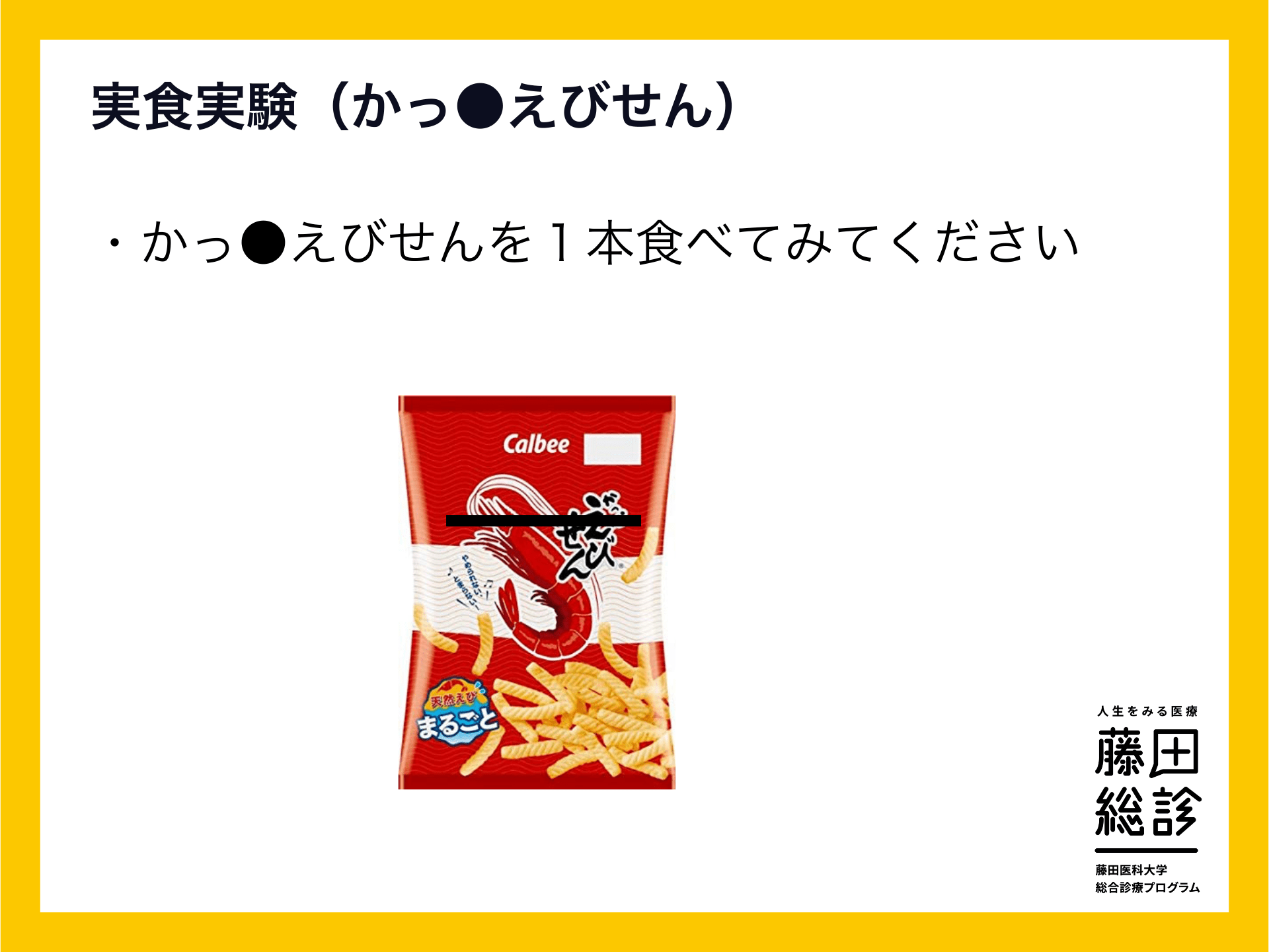#34. 実食実験(かっぱエビせん) ・舌が麻痺したという想定で、舌を動かさず にかっぱえびせんを1本食べてみてください Copyright FUJITA SOUSHIN PROGAM All Right Reserved.