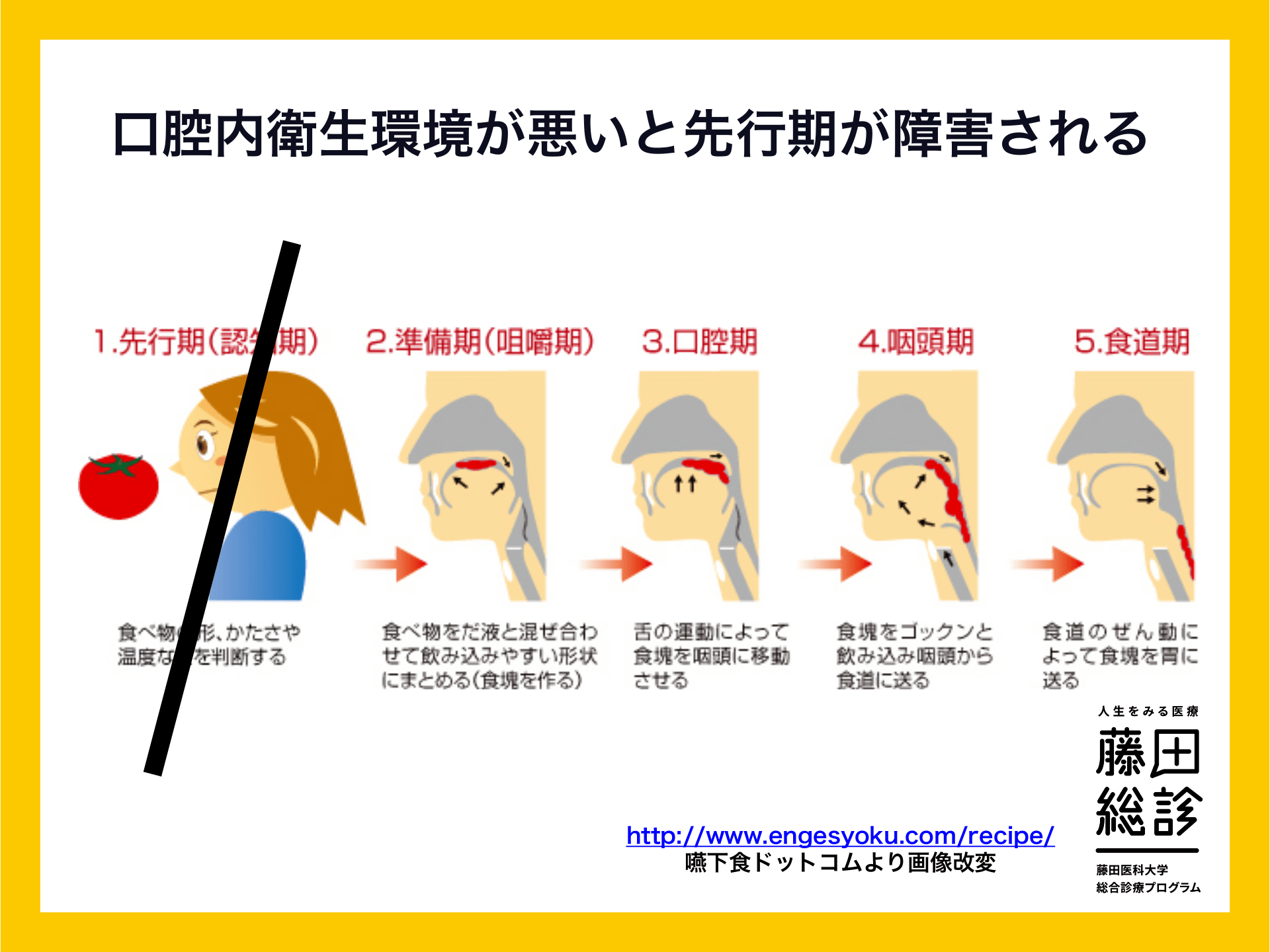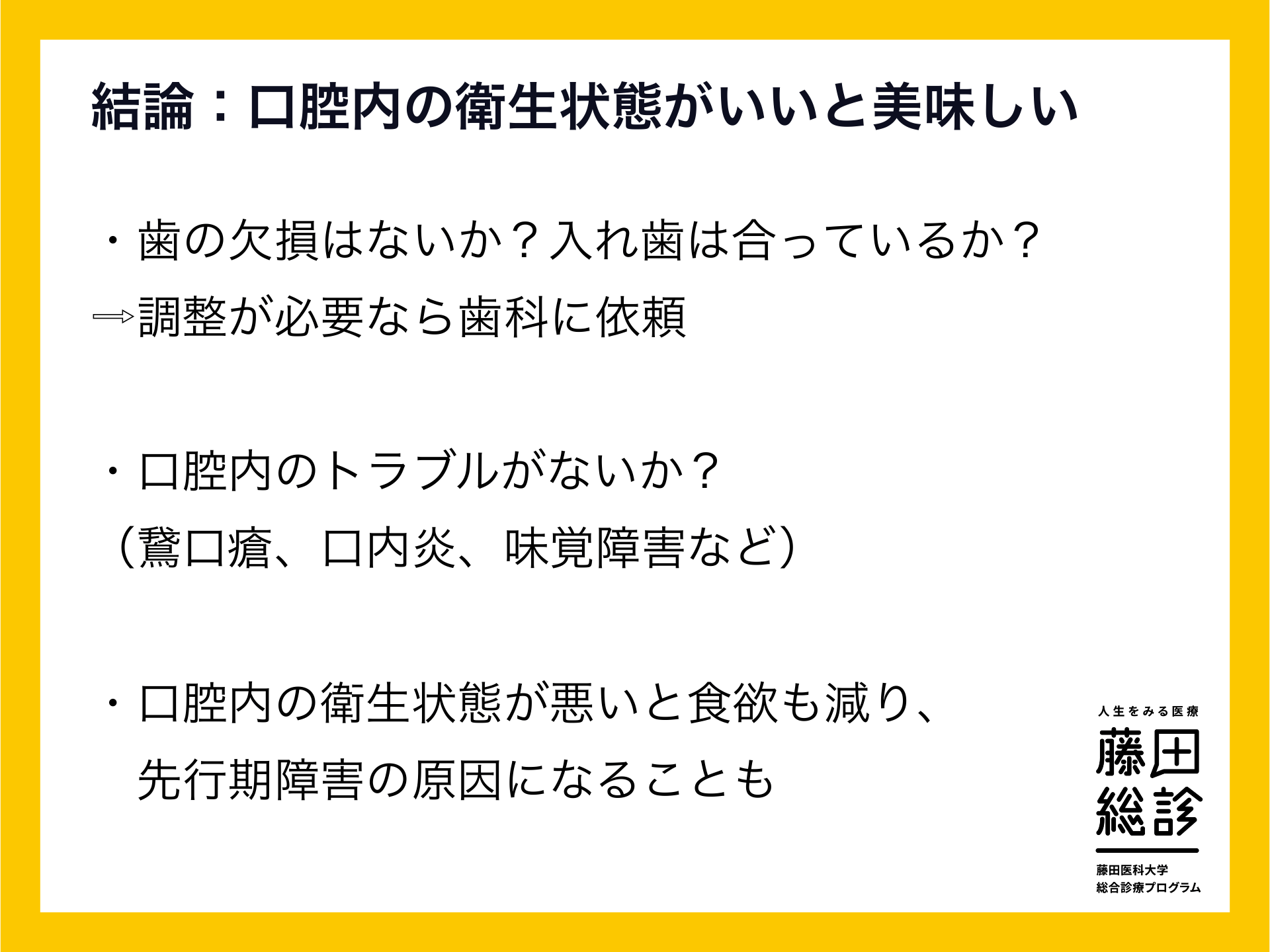 #32. 結論:口腔内の衛生状態がいいと美味しい ・歯の欠損はないか?入れ歯は合っているか? ⇨調整が必要なら歯科に依頼 ・口腔内のトラブルがないか? (鵞口瘡、口内炎、味覚障害など) ・口腔内の衛生状態が悪いと食欲も減り、 先行期障害の原因になることも Copyright FUJITA SOUSHIN PROGAM All Right Reserved.