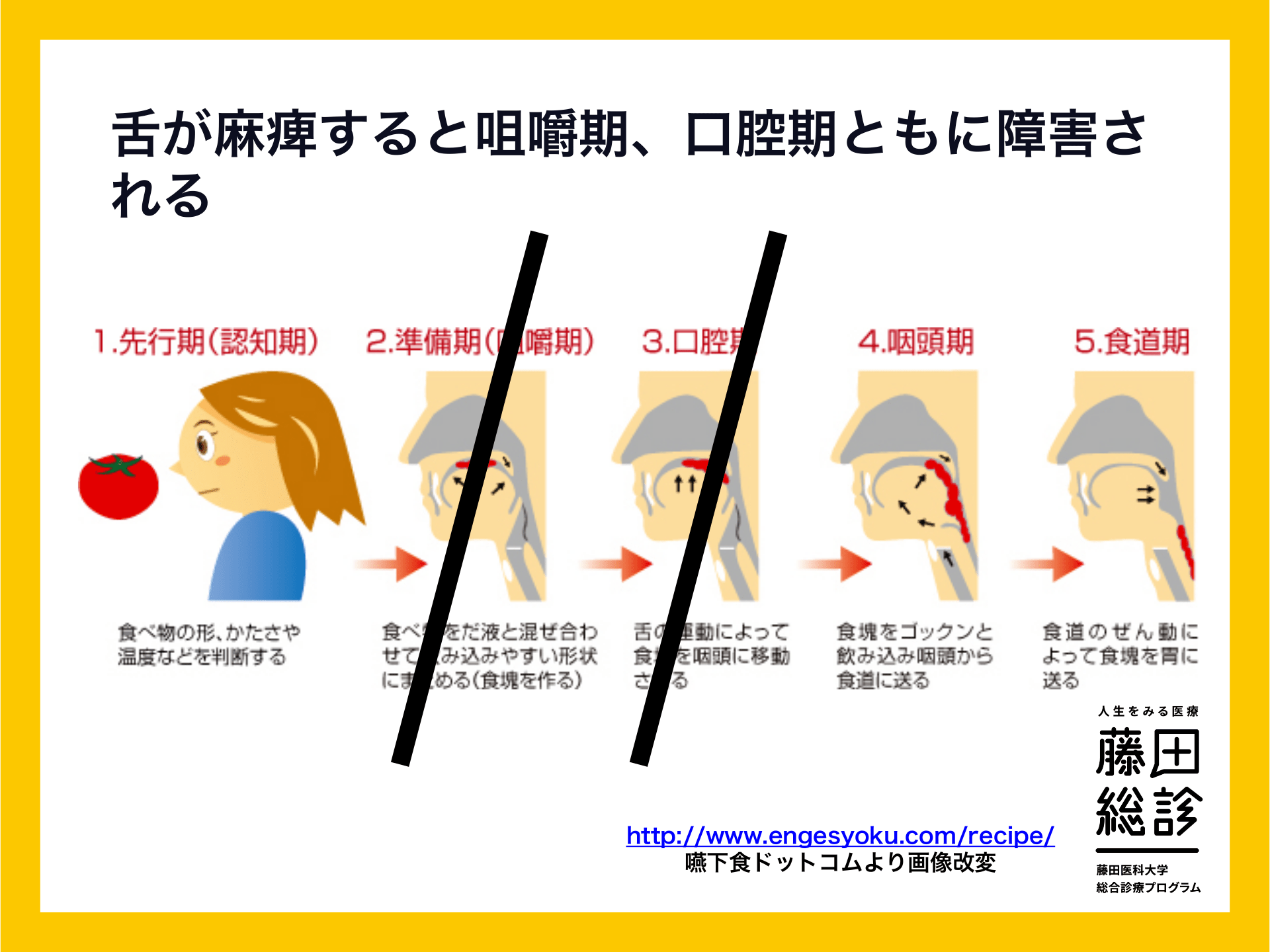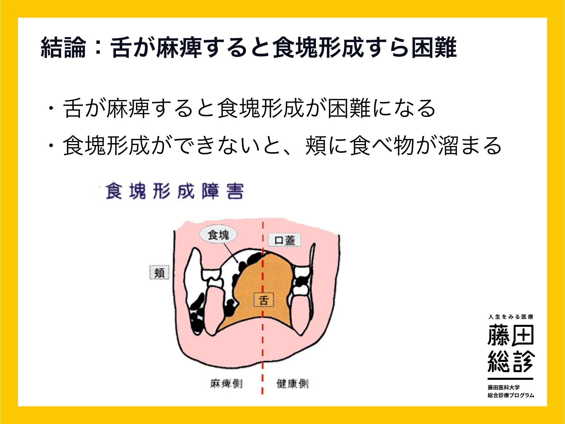 #35. 結論:舌が麻痺すると食塊形成すら困難 ・舌が麻痺すると食塊形成が困難になる ・食塊形成ができないと、頬に食べ物が溜まる Copyright FUJITA SOUSHIN PROGAM All Right Reserved.
