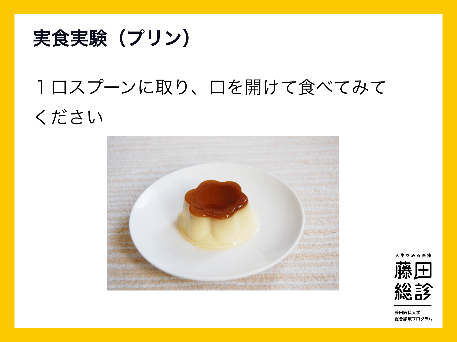 #38. 実食実験(プリン) 1口スプーンに取り、口を開けて食べてみて ください Copyright FUJITA SOUSHIN PROGAM All Right Reserved.