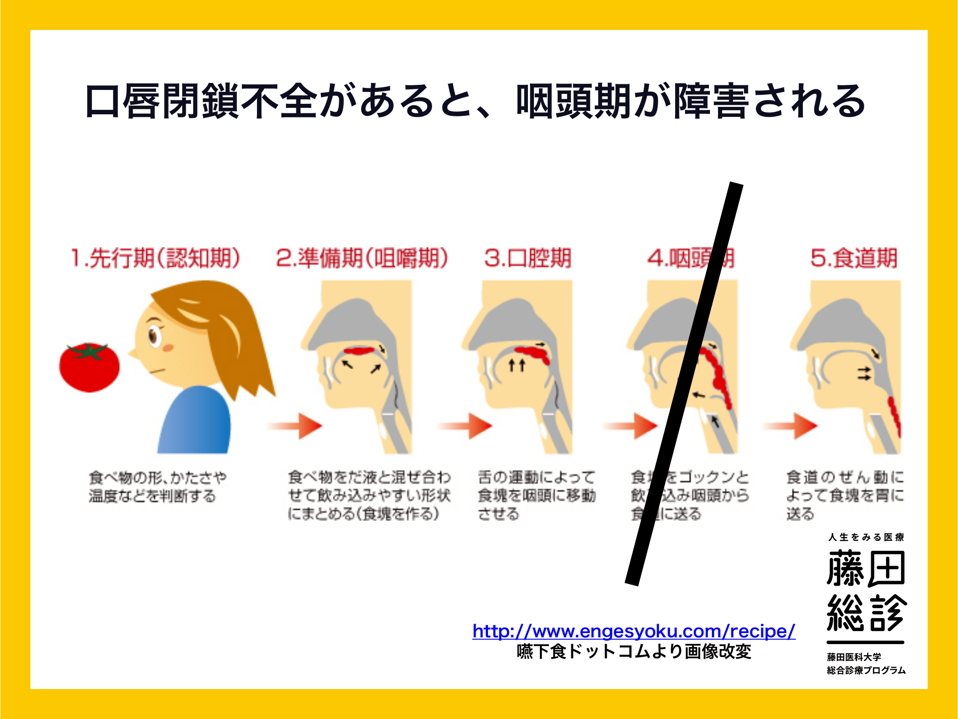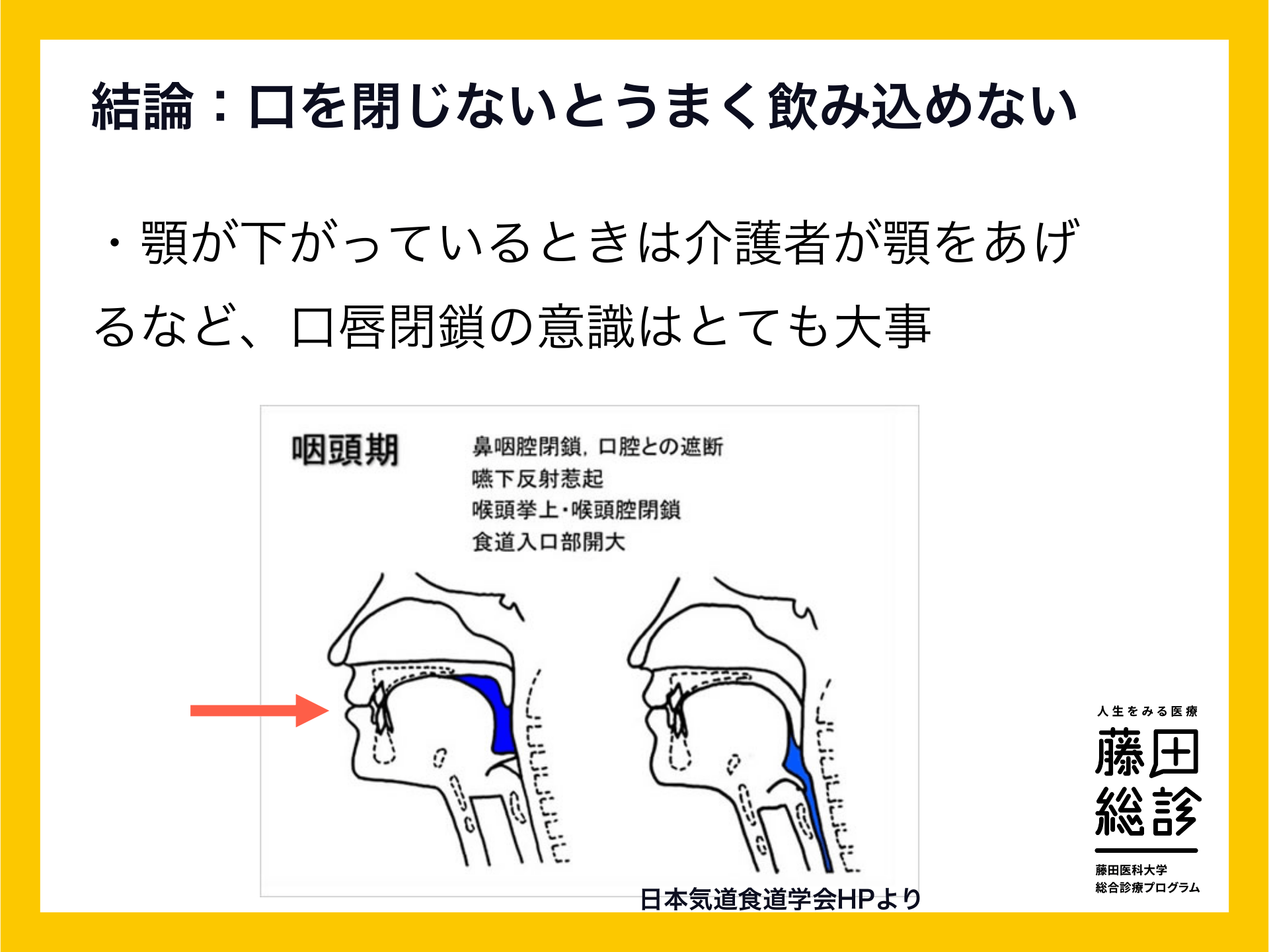 #39. 結論:口を閉じないとうまく飲み込めない ・顎が下がっているときは介護者が顎をあげ るなど、口唇閉鎖の意識はとても大事 日本気道食道学会HPより Copyright FUJITA SOUSHIN PROGAM All Right Reserved.