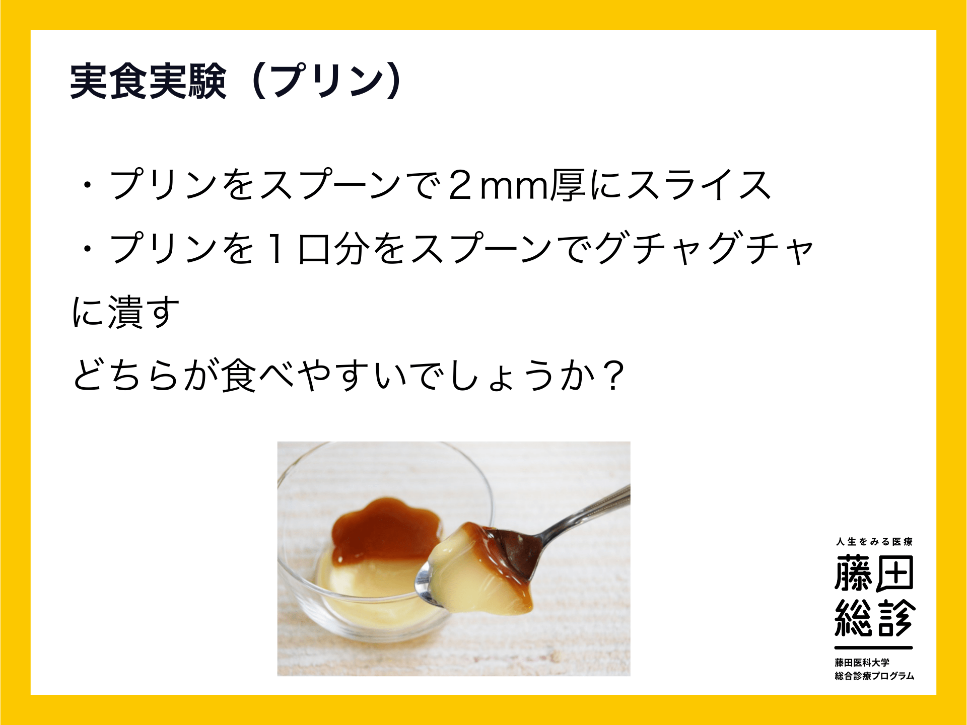 #41. 実食実験(プリン) ・プリンをスプーンで2mm厚にスライス ・プリンを1口分をスプーンでグチャグチャ に潰す どちらが食べやすいでしょうか? Copyright FUJITA SOUSHIN PROGAM All Right Reserved.