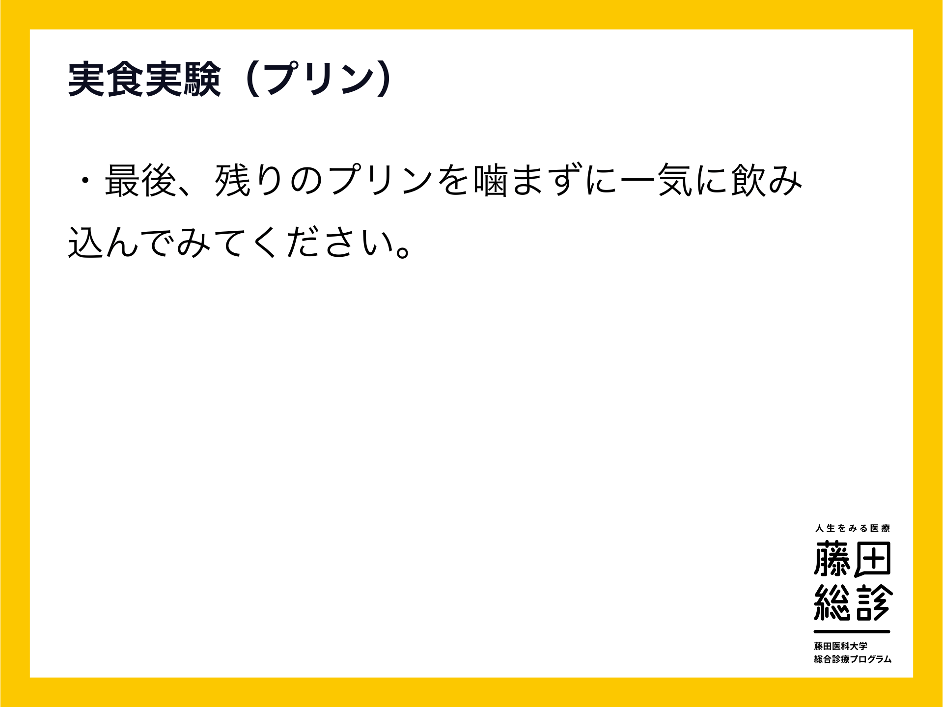 #44. 実食実験(プリン) ・最後、残りのプリンを噛まずに一気に飲み 込んでみてください。 Copyright FUJITA SOUSHIN PROGAM All Right Reserved.