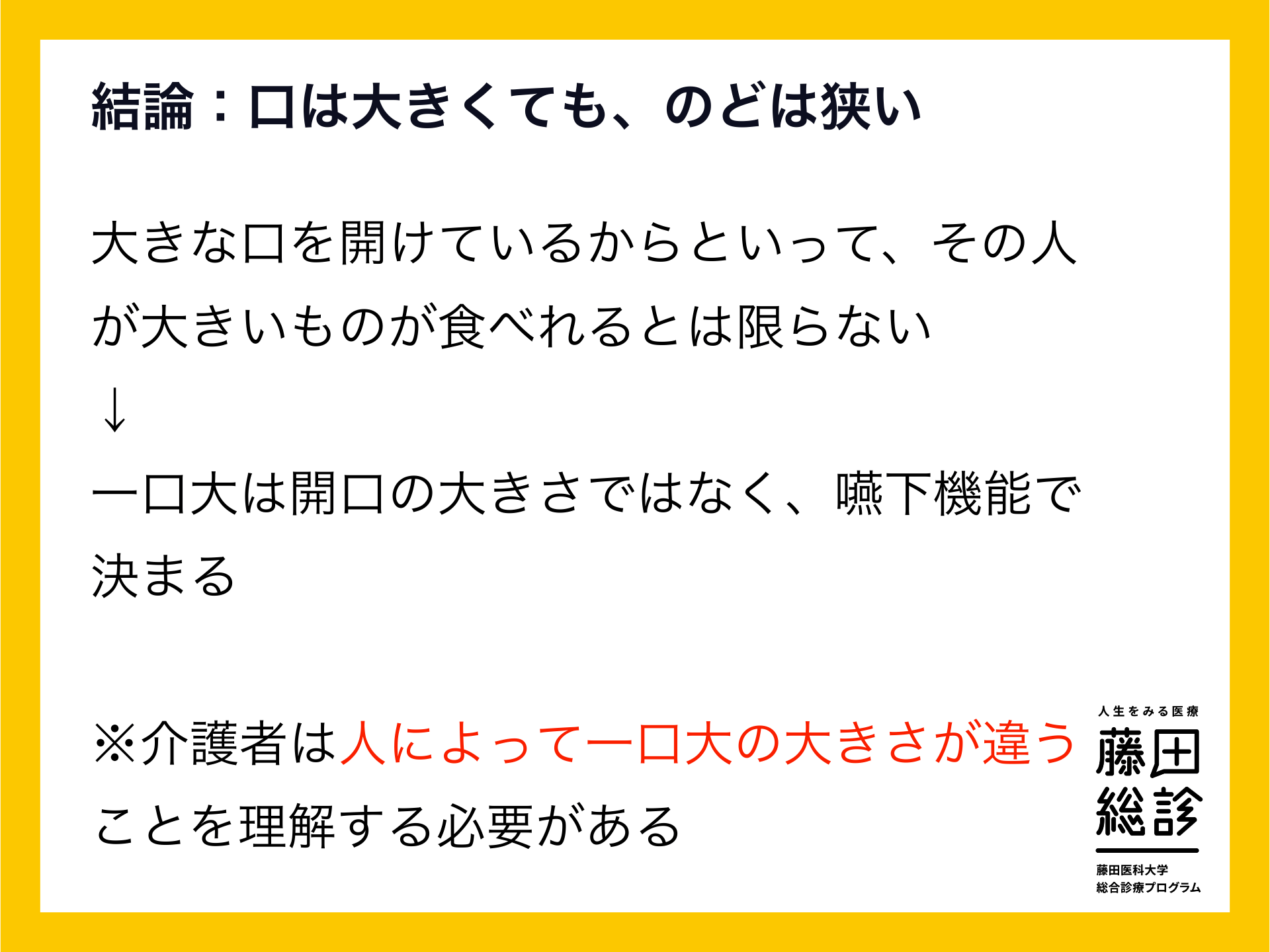 #45. 結論:口は大きくても、のどは狭い 大きな口を開けているからといって、その人 が大きいものが食べれるとは限らない ↓ 一口大は開口の大きさではなく、嚥下機能で 決まる ※介護者は人によって一口大の大きさが違う ことを理解する必要がある Copyright FUJITA SOUSHIN PROGAM All Right Reserved.