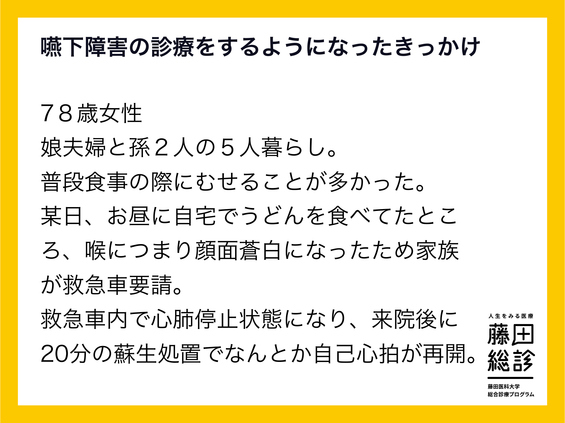 #5. 嚥下障害の診療をするようになったきっかけ 78歳女性 娘夫婦と孫2人の5人暮らし。 普段食事の際にむせることが多かった。 某日、お昼に自宅でうどんを食べてたとこ ろ、喉につまり顔面蒼白になったため家族 が救急車要請。 救急車内で心肺停止状態になり、来院後に 20分の蘇生処置でなんとか自己心拍が再開。 Copyright FUJITA SOUSHIN PROGAM All Right Reserved.