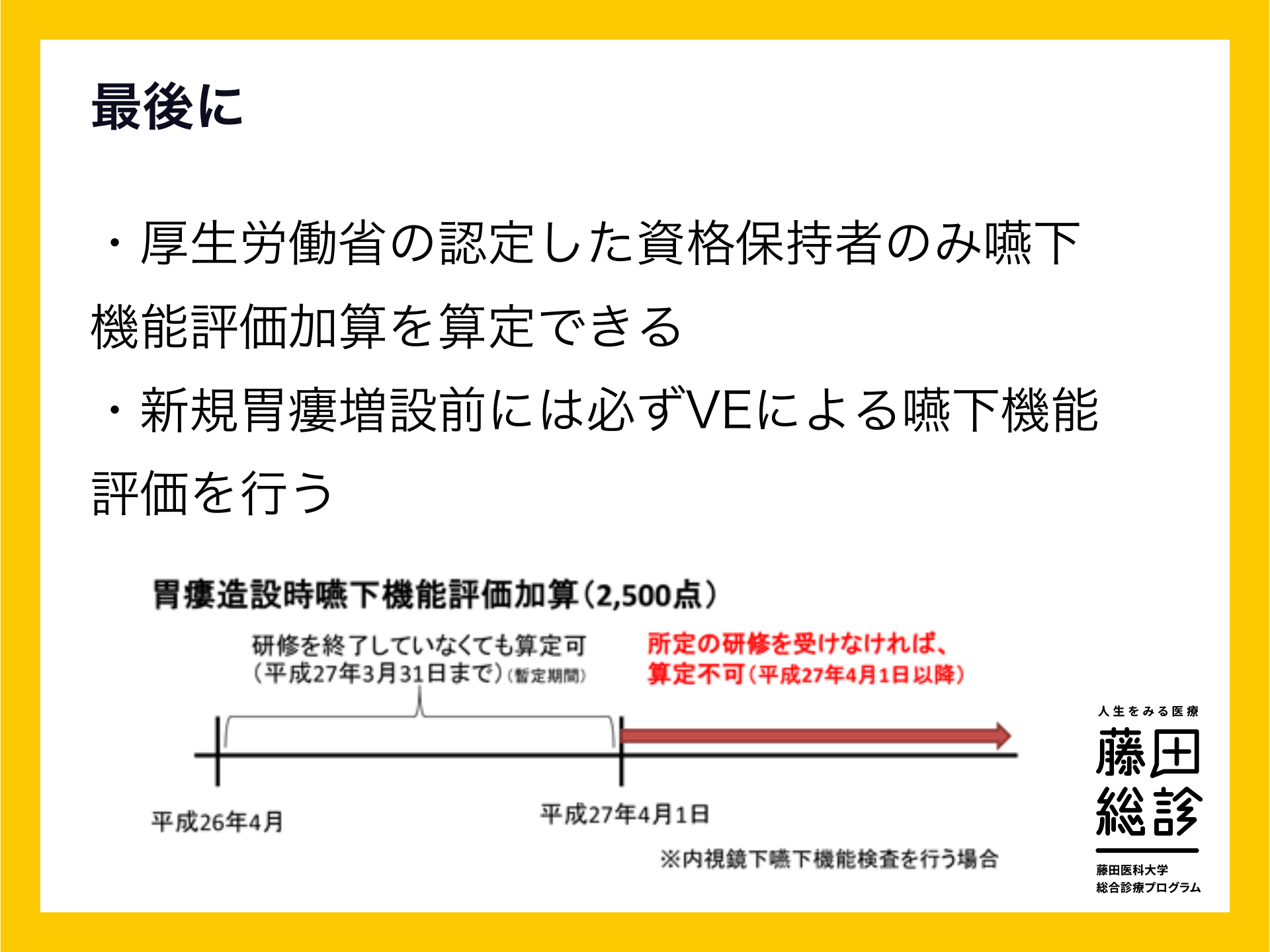 #50. 最後に ・厚生労働省の認定した資格保持者のみ嚥下 機能評価加算を算定できる ・新規胃瘻増設前には必ずVEによる嚥下機能 評価を行う Copyright FUJITA SOUSHIN PROGAM All Right Reserved.
