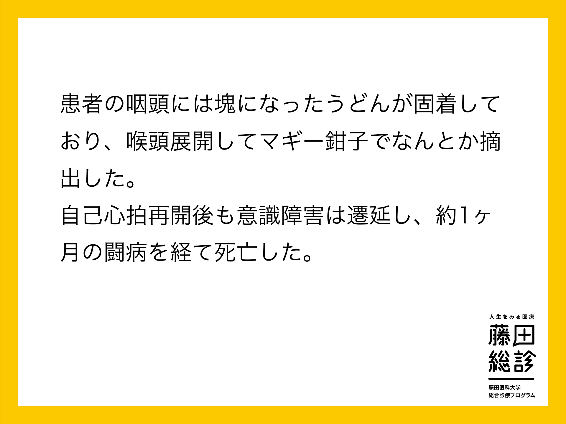 #6. 患者の咽頭には塊になったうどんが固着して おり、喉頭展開してマギー鉗子でなんとか摘 出した。 自己心拍再開後も意識障害は遷延し、約1ヶ 月の闘病を経て死亡した。 Copyright FUJITA SOUSHIN PROGAM All Right Reserved.