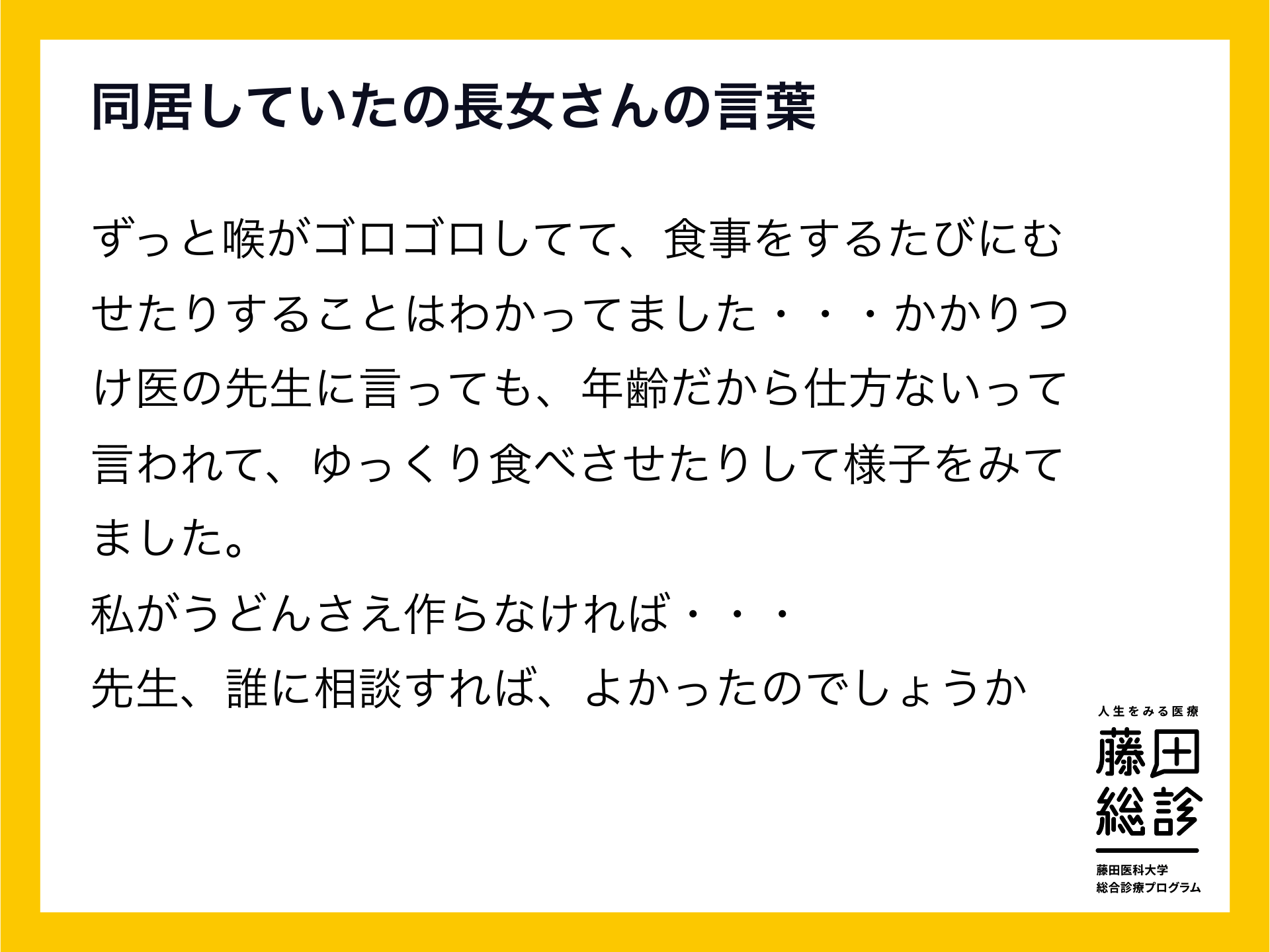 #7. 同居していたの長女さんの言葉 ずっと喉がゴロゴロしてて、食事をするたびにむ せたりすることはわかってました・・・かかりつ け医の先生に言っても、年齢だから仕方ないって 言われて、ゆっくり食べさせたりして様子をみて ました。 私がうどんさえ作らなければ・・・ 先生、誰に相談すれば、よかったのでしょうか Copyright FUJITA SOUSHIN PROGAM All Right Reserved.