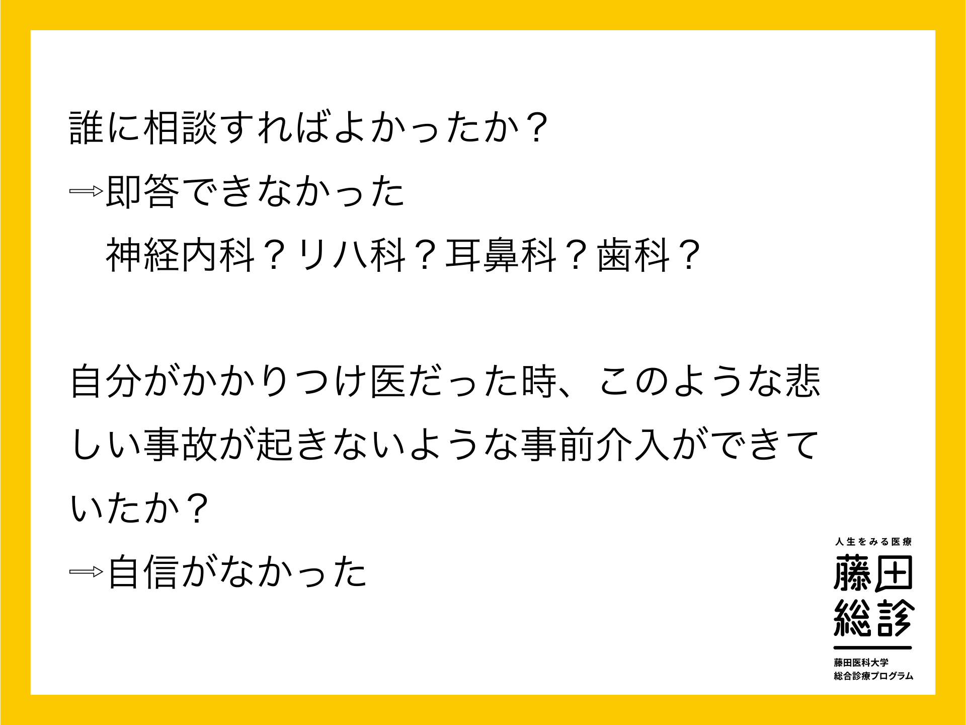 #8. 誰に相談すればよかったか? ⇨即答できなかった 神経内科?リハ科?耳鼻科?歯科? 自分がかかりつけ医だった時、このような悲 しい事故が起きないような事前介入ができて いたか? ⇨自信がなかった Copyright FUJITA SOUSHIN PROGAM All Right Reserved.