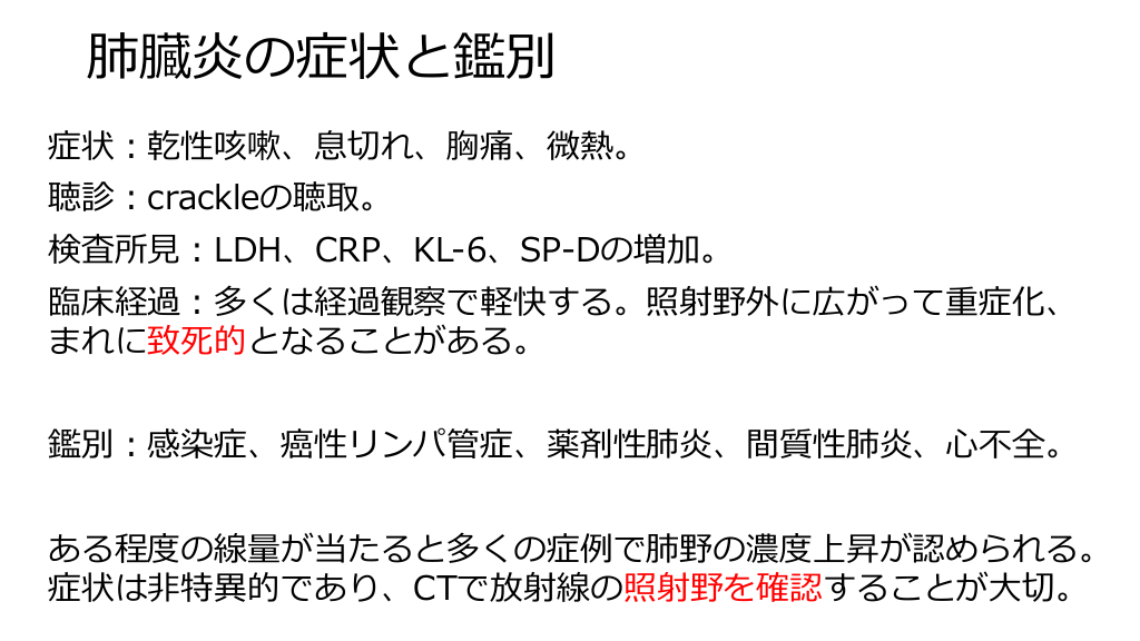 #10. 肺臓炎の症状と鑑別 症状︓乾性咳嗽、息切れ、胸痛、微熱。 聴診︓crackleの聴取。 検査所⾒︓LDH、CRP、KL-6、SP-Dの増加。 臨床経過︓多くは経過観察で軽快する。照射野外に広がって重症化、 まれに致死的となることがある。 鑑別︓感染症、癌性リンパ管症、薬剤性肺炎、間質性肺炎、⼼不全。 ある程度の線量が当たると多くの症例で肺野の濃度上昇が認められる。 症状は⾮特異的であり、CTで放射線の照射野を確認することが⼤切。