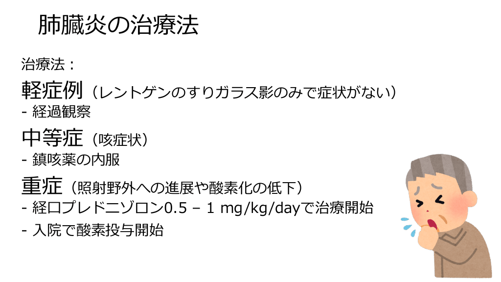 #11. 肺臓炎の治療法 治療法︓ 軽症例(レントゲンのすりガラス影のみで症状がない) - 経過観察 中等症(咳症状) - 鎮咳薬の内服 重症(照射野外への進展や酸素化の低下) - 経⼝プレドニゾロン0.5 – 1 mg/kg/dayで治療開始 - ⼊院で酸素投与開始
