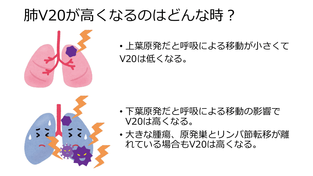 #13. 肺V20が⾼くなるのはどんな時︖ • 上葉原発だと呼吸による移動が⼩さくて V20は低くなる。 • 下葉原発だと呼吸による移動の影響で V20は⾼くなる。 • ⼤きな腫瘍、原発巣とリンパ節転移が離 れている場合もV20は⾼くなる。