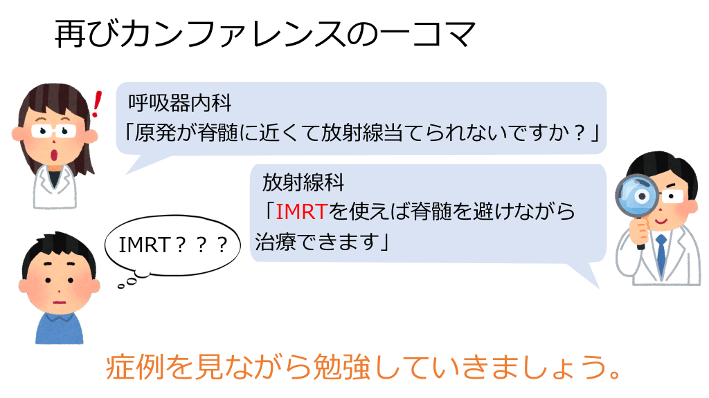 #14. 再びカンファレンスの⼀コマ 呼吸器内科 「原発が脊髄に近くて放射線当てられないですか︖」 IMRT︖︖︖ 放射線科 「IMRTを使えば脊髄を避けながら 治療できます」 症例を⾒ながら勉強していきましょう。
