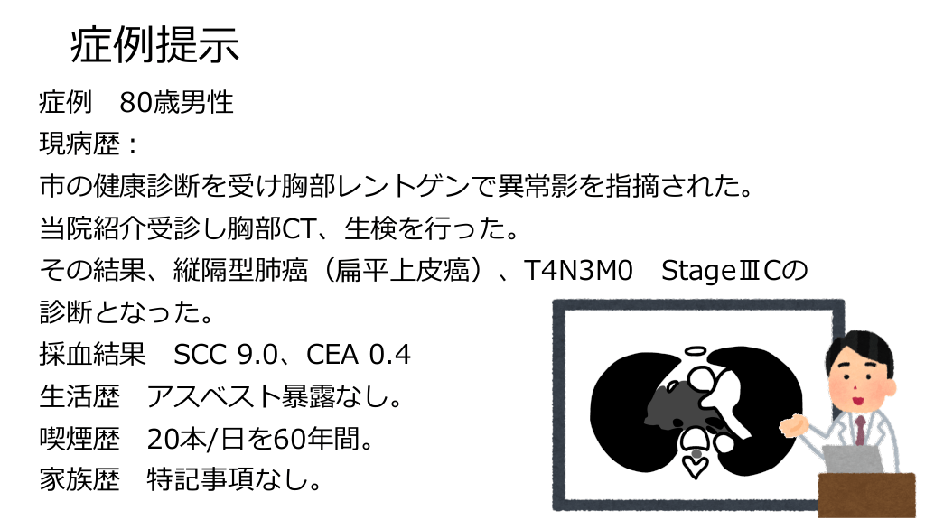 #15. 症例提⽰ 症例 80歳男性 現病歴︓ 市の健康診断を受け胸部レントゲンで異常影を指摘された。 当院紹介受診し胸部CT、⽣検を⾏った。 その結果、縦隔型肺癌(扁平上⽪癌)、T4N3M0 StageⅢCの 診断となった。 採⾎結果 SCC 9.0、CEA 0.4 ⽣活歴 アスベスト暴露なし。 喫煙歴 20本/⽇を60年間。 家族歴 特記事項なし。