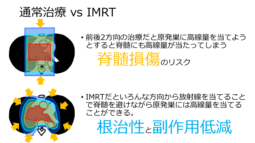 #16. 通常治療 vs IMRT • 前後2⽅向の治療だと原発巣に⾼線量を当てよう とすると脊髄にも⾼線量が当たってしまう 脊髄損傷のリスク • IMRTだといろんな⽅向から放射線を当てること で脊髄を避けながら原発巣には⾼線量を当てる ことができる。 根治性と副作⽤低減
