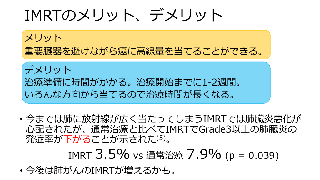 #17. IMRTのメリット、デメリット メリット 重要臓器を避けながら癌に⾼線量を当てることができる。 デメリット 治療準備に時間がかかる。治療開始までに1-2週間。 いろんな⽅向から当てるので治療時間が⻑くなる。 • 今までは肺に放射線が広く当たってしまうIMRTでは肺臓炎悪化が ⼼配されたが、通常治療と⽐べてIMRTでGrade3以上の肺臓炎の 発症率が下がることが⽰された(5)。 IMRT 3.5% vs 通常治療 7.9% (p = 0.039) • 今後は肺がんのIMRTが増えるかも。