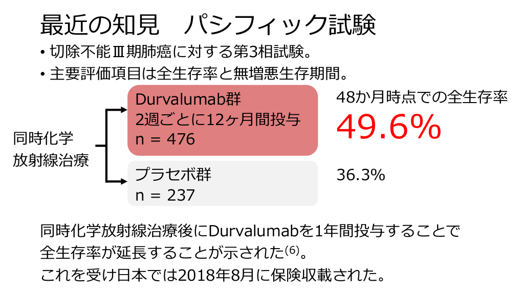 #18. 最近の知⾒ パシフィック試験 • 切除不能Ⅲ期肺癌に対する第3相試験。 • 主要評価項⽬は全⽣存率と無増悪⽣存期間。 同時化学 放射線治療 Durvalumab群 2週ごとに12ヶ⽉間投与 n = 476 48か⽉時点での全⽣存率 プラセボ群 n = 237 36.3% 49.6% 同時化学放射線治療後にDurvalumabを1年間投与することで 全⽣存率が延⻑することが⽰された(6)。 これを受け⽇本では2018年8⽉に保険収載された。