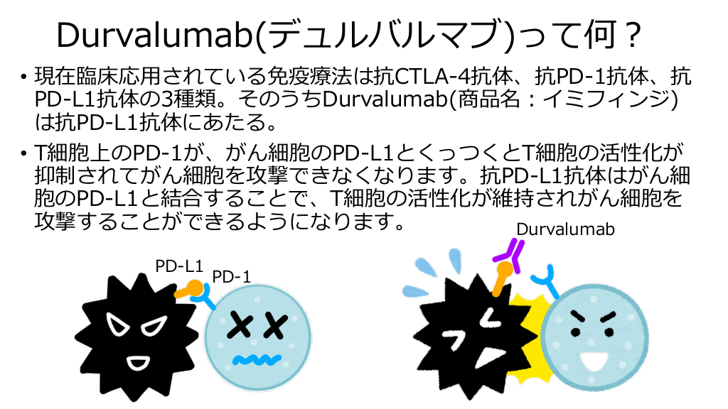 #19. Durvalumab(デュルバルマブ)って何︖ • 現在臨床応⽤されている免疫療法は抗CTLA-4抗体、抗PD-1抗体、抗 PD-L1抗体の3種類。そのうちDurvalumab(商品名︓イミフィンジ) は抗PD-L1抗体にあたる。 • T細胞上のPD-1が、がん細胞のPD-L1とくっつくとT細胞の活性化が 抑制されてがん細胞を攻撃できなくなります。抗PD-L1抗体はがん細 胞のPD-L1と結合することで、T細胞の活性化が維持されがん細胞を 攻撃することができるようになります。 Durvalumab PD-L1 PD-1