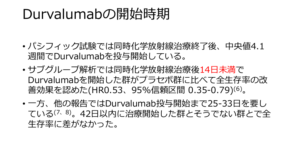 #20. Durvalumabの開始時期 • パシフィック試験では同時化学放射線治療終了後、中央値4.1 週間でDurvalumabを投与開始している。 • サブグループ解析では同時化学放射線治療後14⽇未満で Durvalumabを開始した群がプラセボ群に⽐べて全⽣存率の改 善効果を認めた(HR0.53、95%信頼区間 0.35-0.79)(6)。 • ⼀⽅、他の報告ではDurvalumab投与開始まで25-33⽇を要し ている(7、8)。42⽇以内に治療開始した群とそうでない群とで全 ⽣存率に差がなかった。